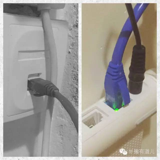 图解:左图家里墙上的网线插口,插进去没有任何提示灯;右图是小米路由器的网线插口,插进去信号通的话就有绿灯闪烁。
