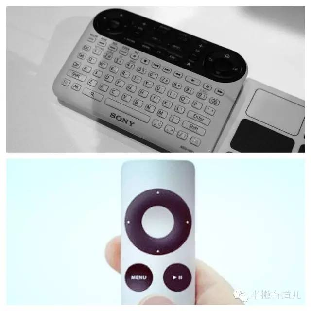 图解:上图是Sony 给Google TV 出的遥控器,作为观看辅助的遥控按键不仅细小还密密麻麻……;下图是Apple TV 的遥控器,3个大按钮搞定,简约帅气!