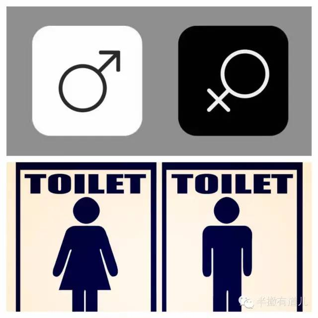 图解:上图的男女厕所标示设计不规范,左边是白底黑标示,右边是黑底白标示;下图则是更容易理解的公共厕所性别标示,因为男女处于同级的关系。