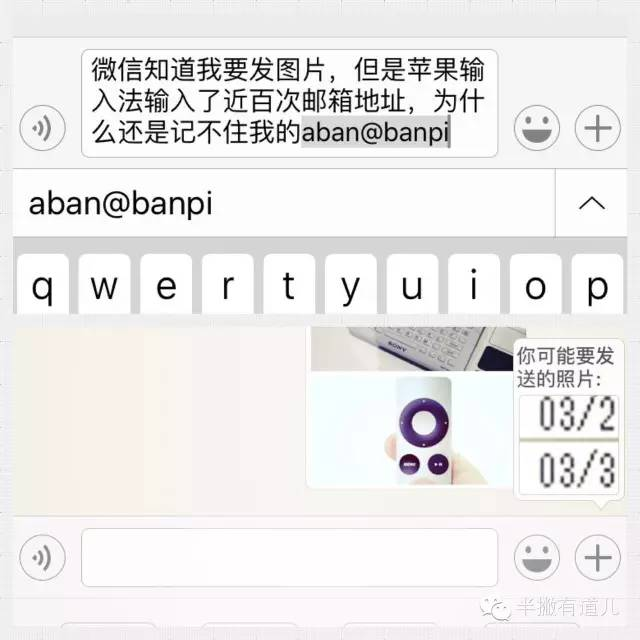 图解:上图是苹果系统输入法,在系统中我填写过近百次的邮箱地址,但是需要输入时它总是不会自动填写;下图微信的聊天窗口,只要我软件中保存了新图片,我要发送该图片之前,微信就会自动跳出该图片的发送提示;