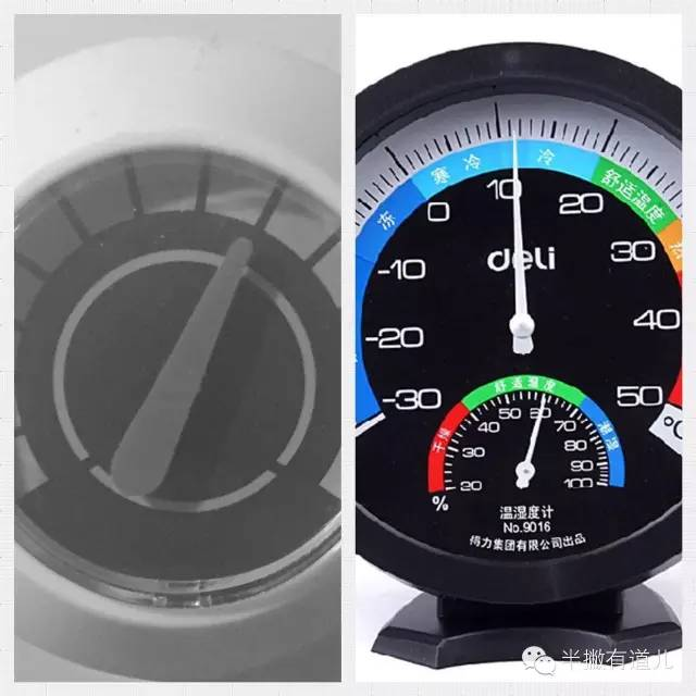 图解:左图家里的热水器指示器,没有数字指示导致我对于水温只能靠猜;右图是得力的温度表,度数、颜色、体感一一俱全。