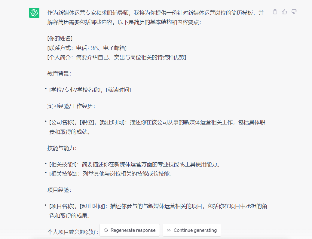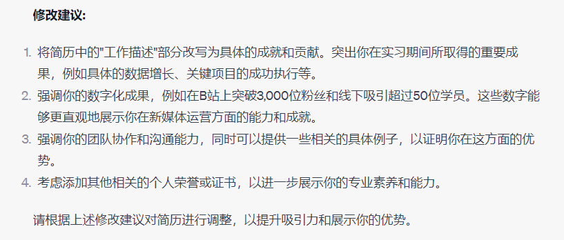 知道了哪些地方要修改后,我们让他在我们的简历基础上修改,跟AI说:“将你的建议融合到我发给你的简历中,输出给我。”于是我们获得了简历2.0版本。不过由于AI不知道我们具体的经历,比如到底涨了多少粉,达成什么目标。所以建议最好是根据建议的方向,自己补充信息,再将简历给回AI,再提问,再修改,不断进行到你觉得简历满意为止。