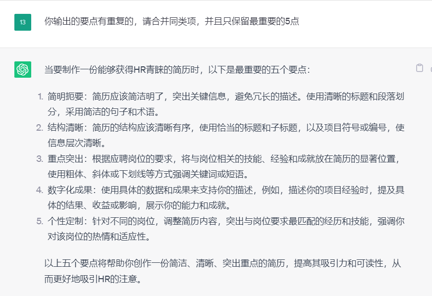 我让AI保留了最重要的5点。排版方面的内容可以用简历模板来规范,我们主要看看关于内容的要点:
