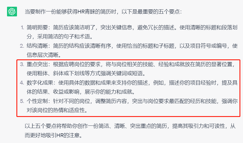 要想获得一份深得hr青睐的简历,我们自己要先知道,好简历的要点是什么。我们先来问问AI。