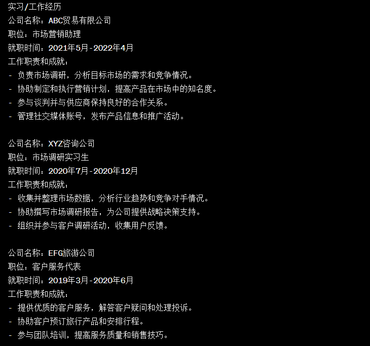 有了岗位JD以后,我们需要按照通用的框架模板,把自己信息填充进去,就获得了一个基本上60分的简历。