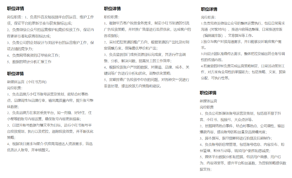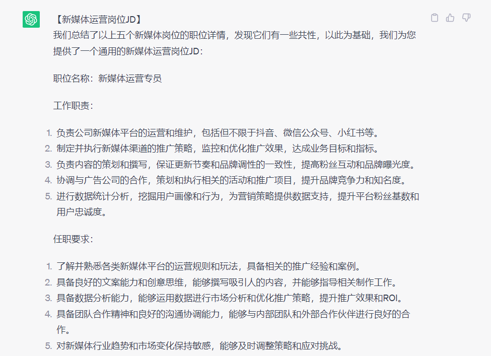 这样做的目的,是为了能够让你的简历适配更多的同类型岗位。假设你的目标岗位是【新媒体运营】,将5个新媒体运营岗位的JD喂给AI后,得到这样的内容。