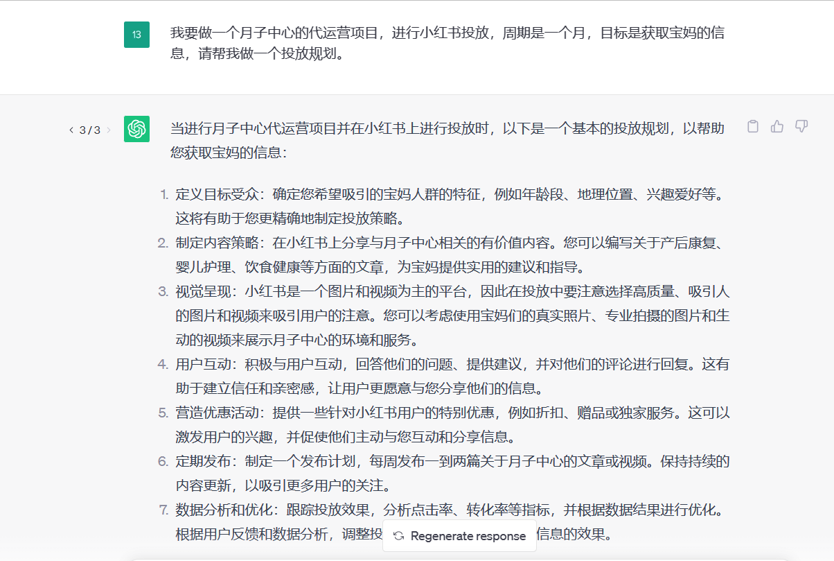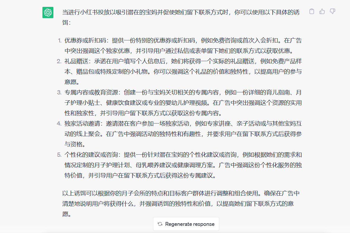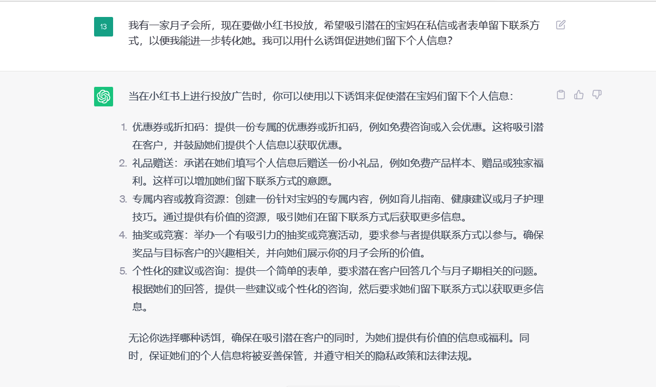 我们来看这个案例。她说“我有一家月子会所,现在要做小红书投放,希望吸引潜在的宝妈在私信或者表单留下联系方式,以便我能进一步转化她。我可以用什么诱饵促进她们留下个人信息?”