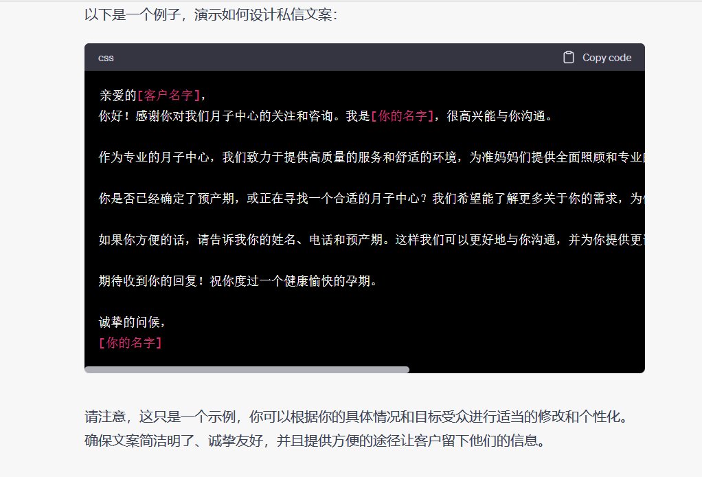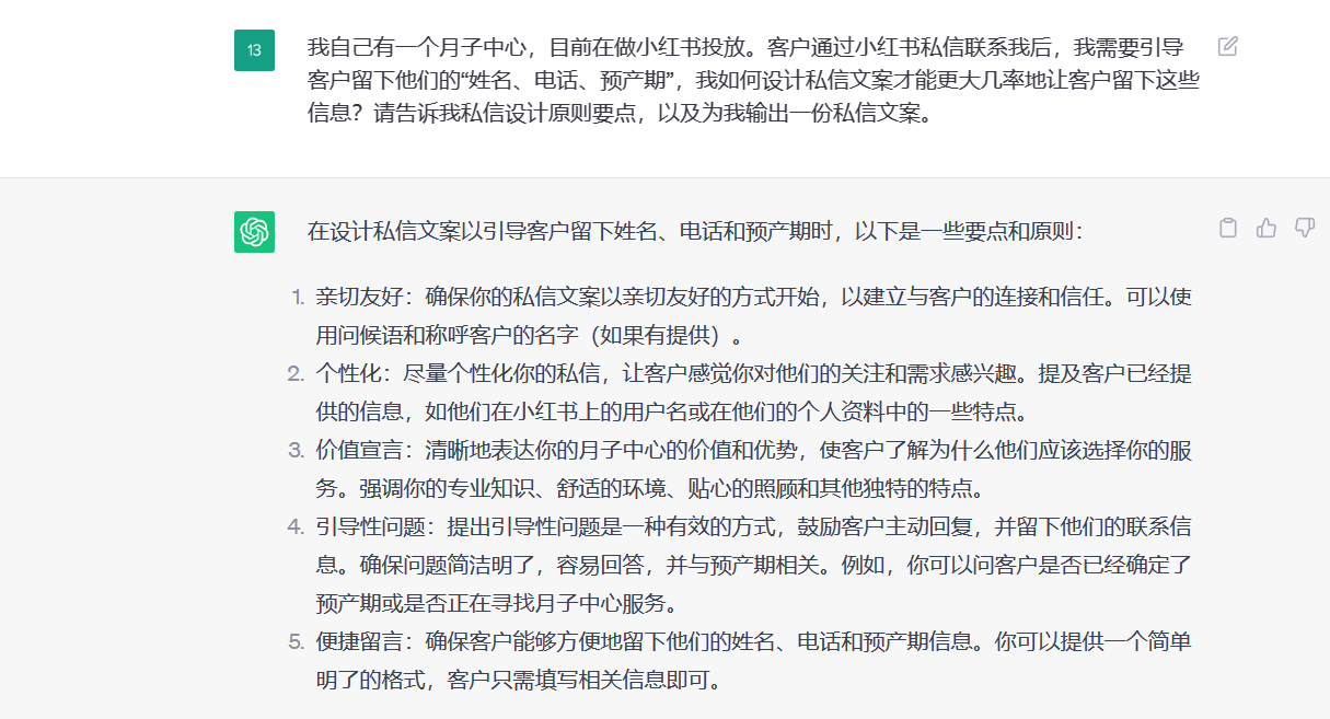 这时候,向AI要私信话术的原则和直接输出一版话术。这是给AI发的指令:“我自己有一个月子中心,目前在做小红书投放。客户通过小红书私信联系我后,我需要引导客户留下他们的“姓名、电话、预产期”,我如何设计私信文案才能更大几率地让客户留下这些信息?请告诉我私信设计原则要点,以及为我输出一份私信文案。”