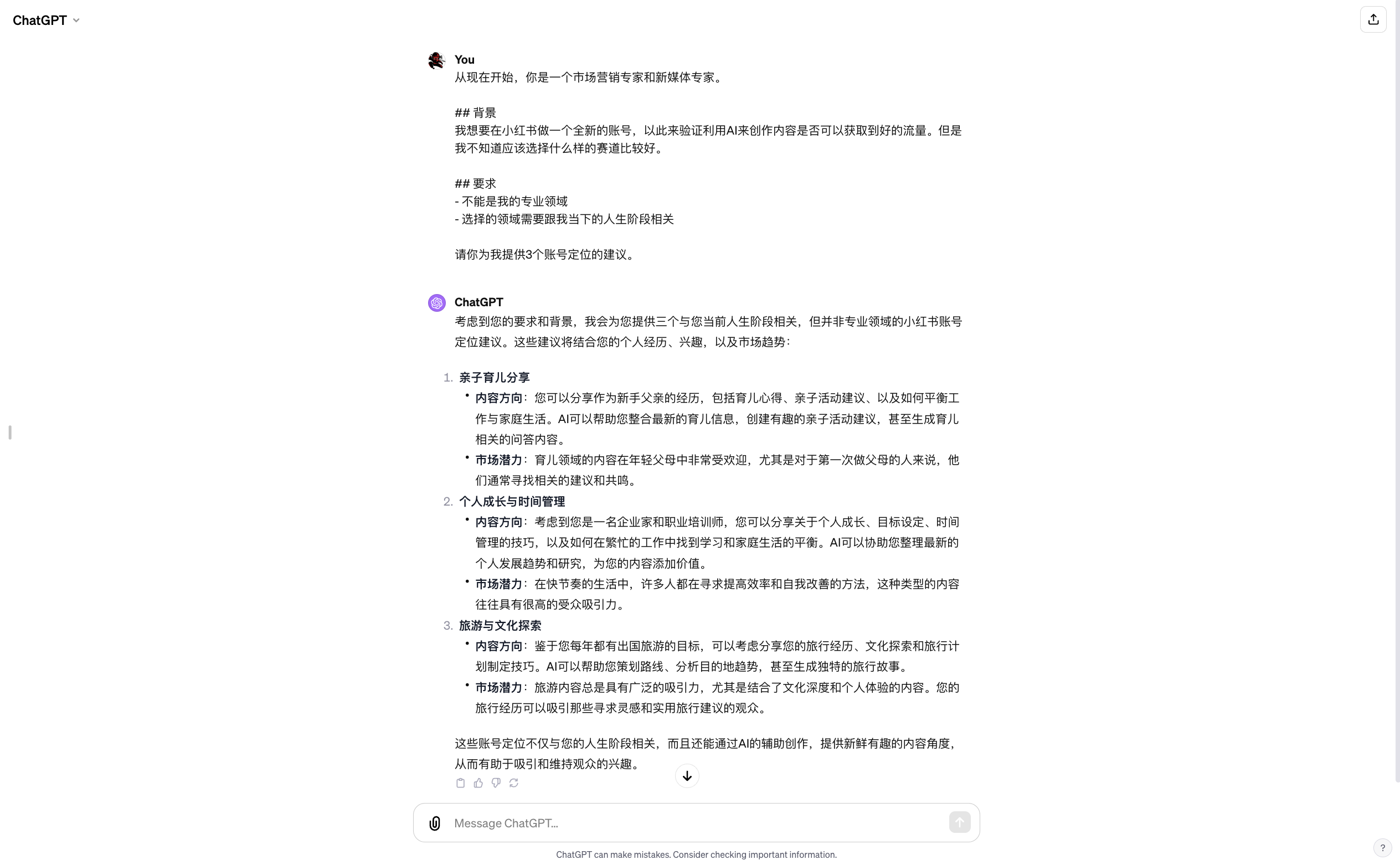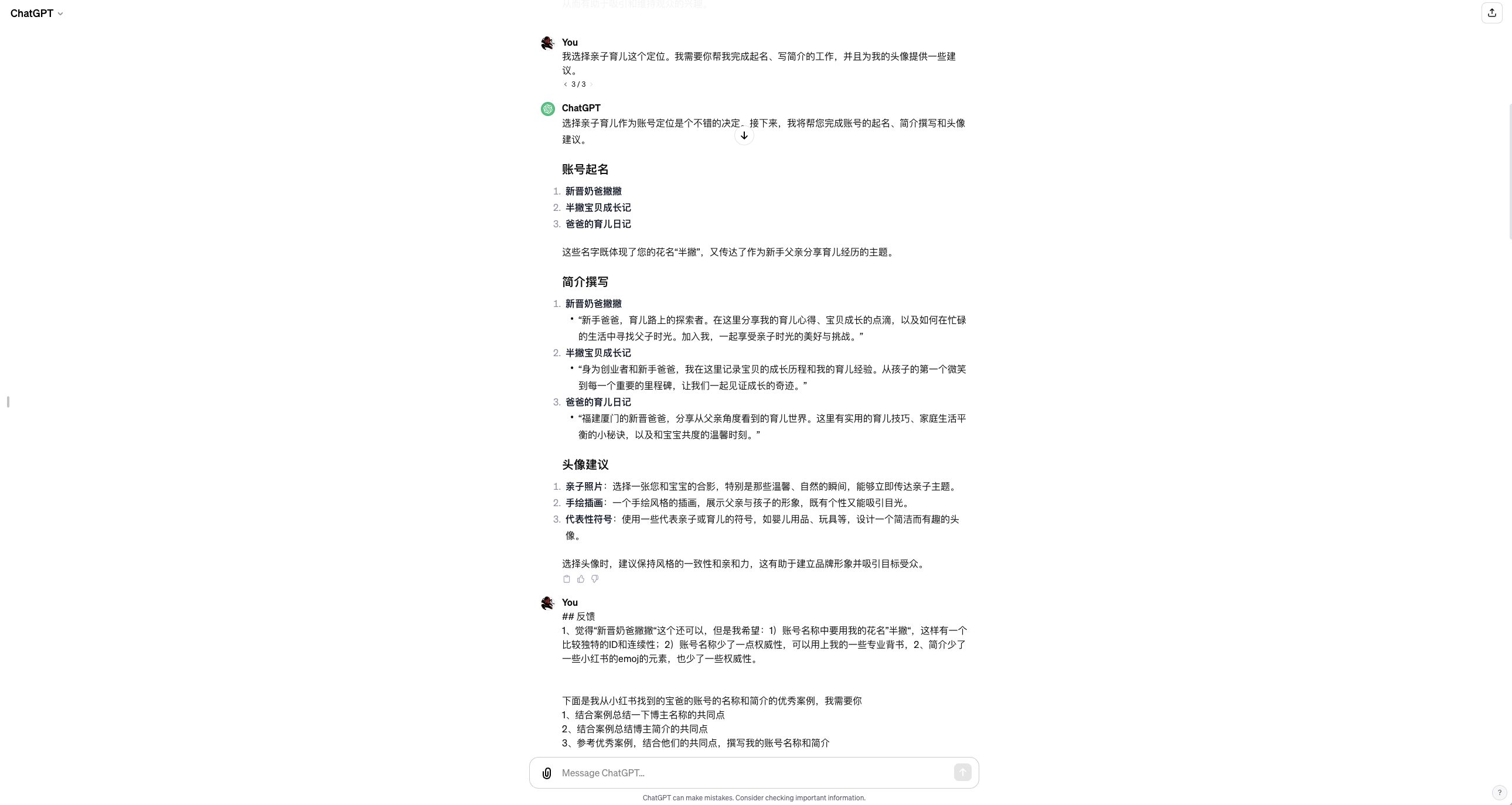 接着在 GPT 中把我刚才的反馈和小红书参考账号的列表都输入给它,然后让他先总结,在 2 次优化(注意:为什么先总结在输出呢?也是给 AI 一个学习的过程)。
