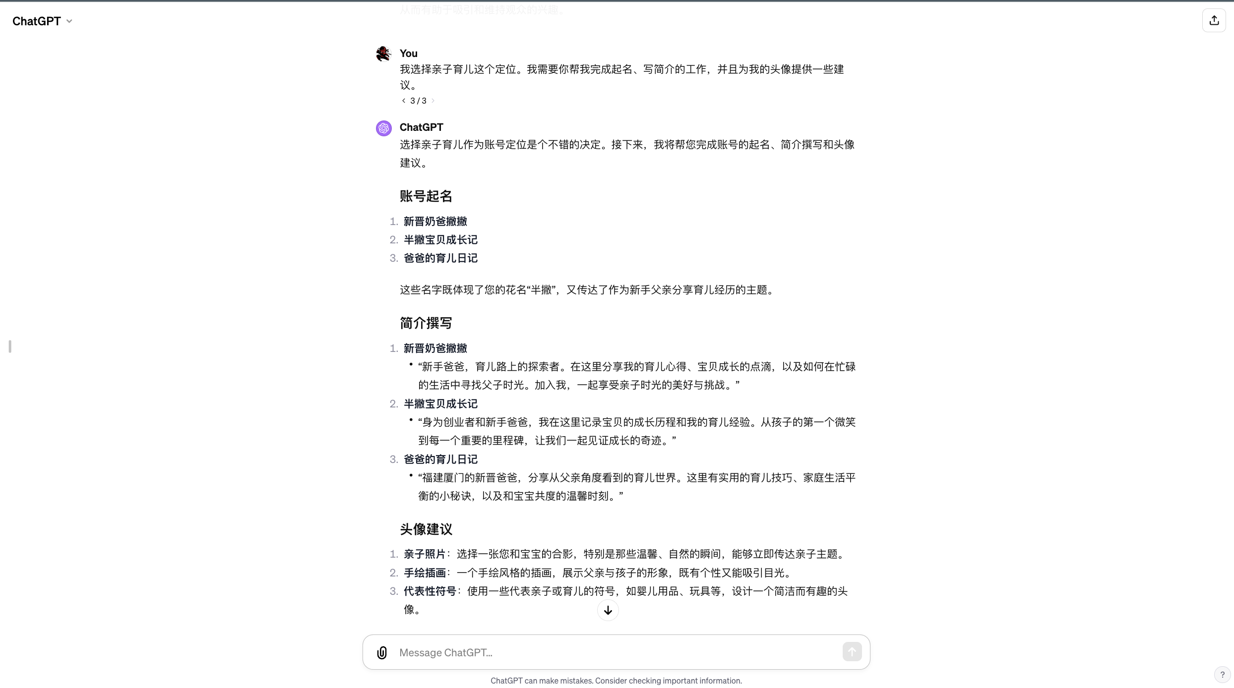 有了定位以后,第二个步骤就是:取名、写简介、做头像,江湖称「账号包装 3 件套」。在这个实验过程,我会尽量全部用 AI 来完成。