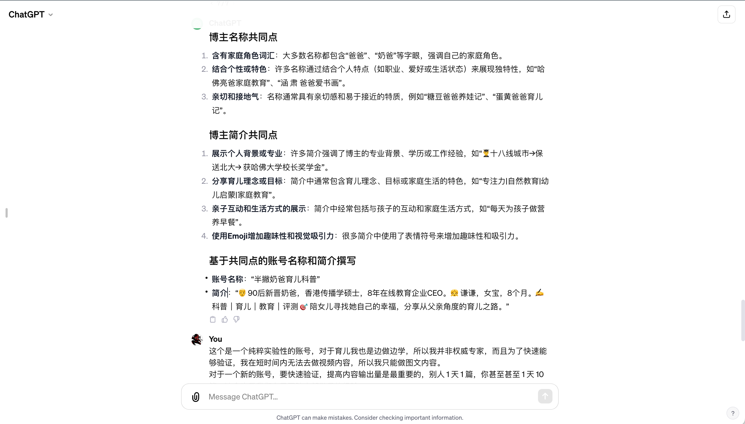 有了数据以后,我发现第 2 次的输出中, GPT 对这一些博主列表进行分析,给出了名称的简介的共性,洞察的确很好!比如对账号名称都提及的含有家庭角色、亲切接地气等等;还有关于这一些账号的简介都「展现个人背景和专业」「使用 Emoj 增加趣味性」