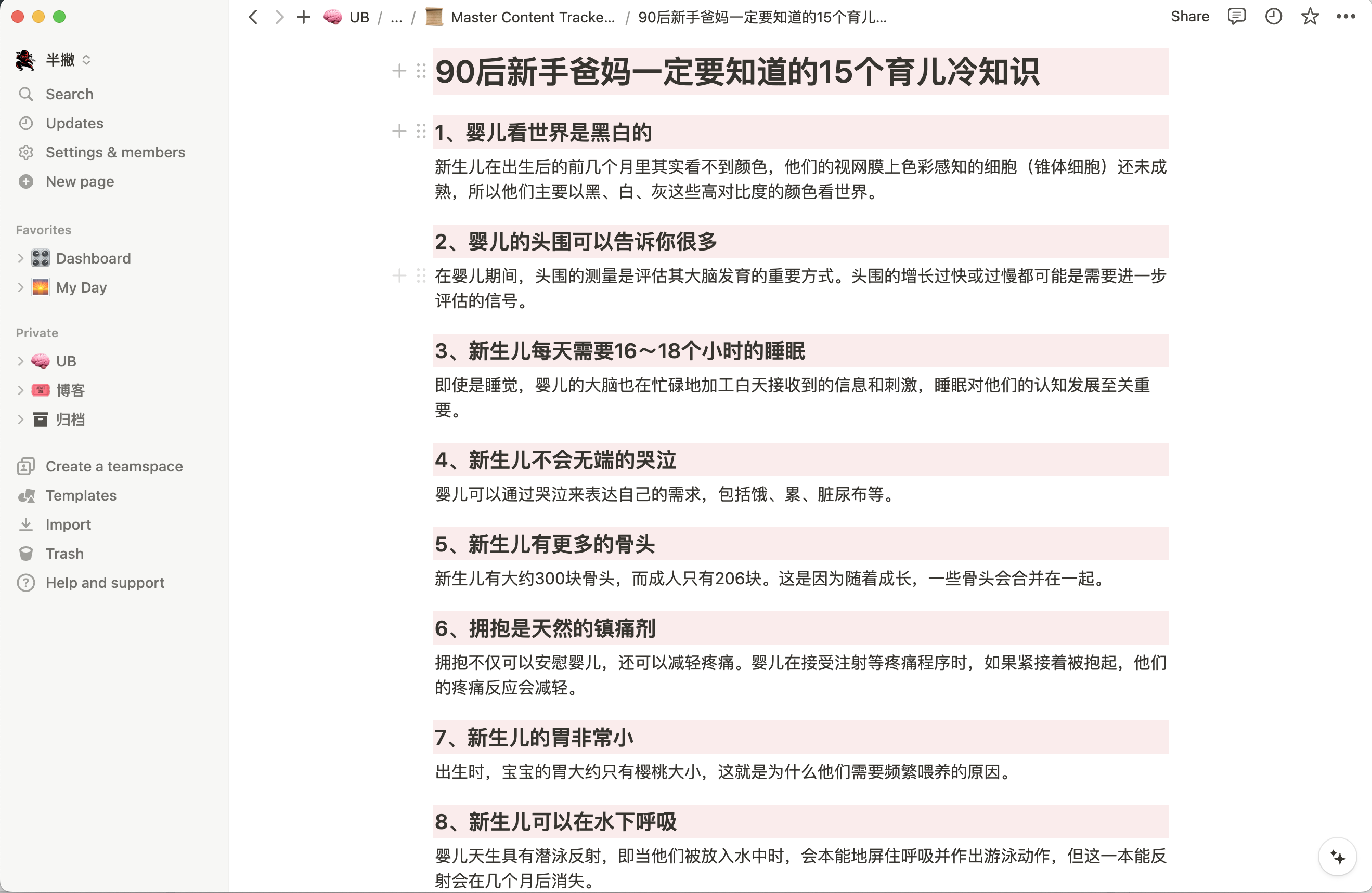 因为我也是一个爸爸,选题我没有太纠结,第一次做爸爸,很多名词都是第一次听,什么拍嗝、头尾、混合喂养,因此我的第一个选题我用【90后新手爸妈一定要知道的15个育儿冷知识】,在 Notion AI 中空格+选题,输入指令直接就出来了。