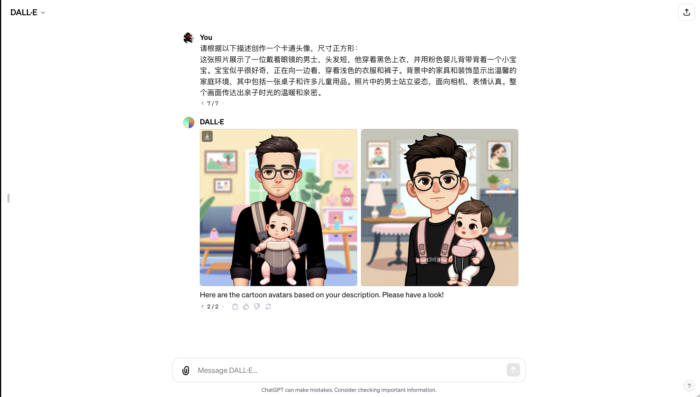 头像的部分,既然是一个纯 AI 的实验,我根据 GPT 的图像描述,拍了一张跟女儿的合照,然后让 GPT 去描述一下这个照片,然后再用这个描述词,在 GPT 的 DALLE 中去生成一张小红书的卡通头像。
