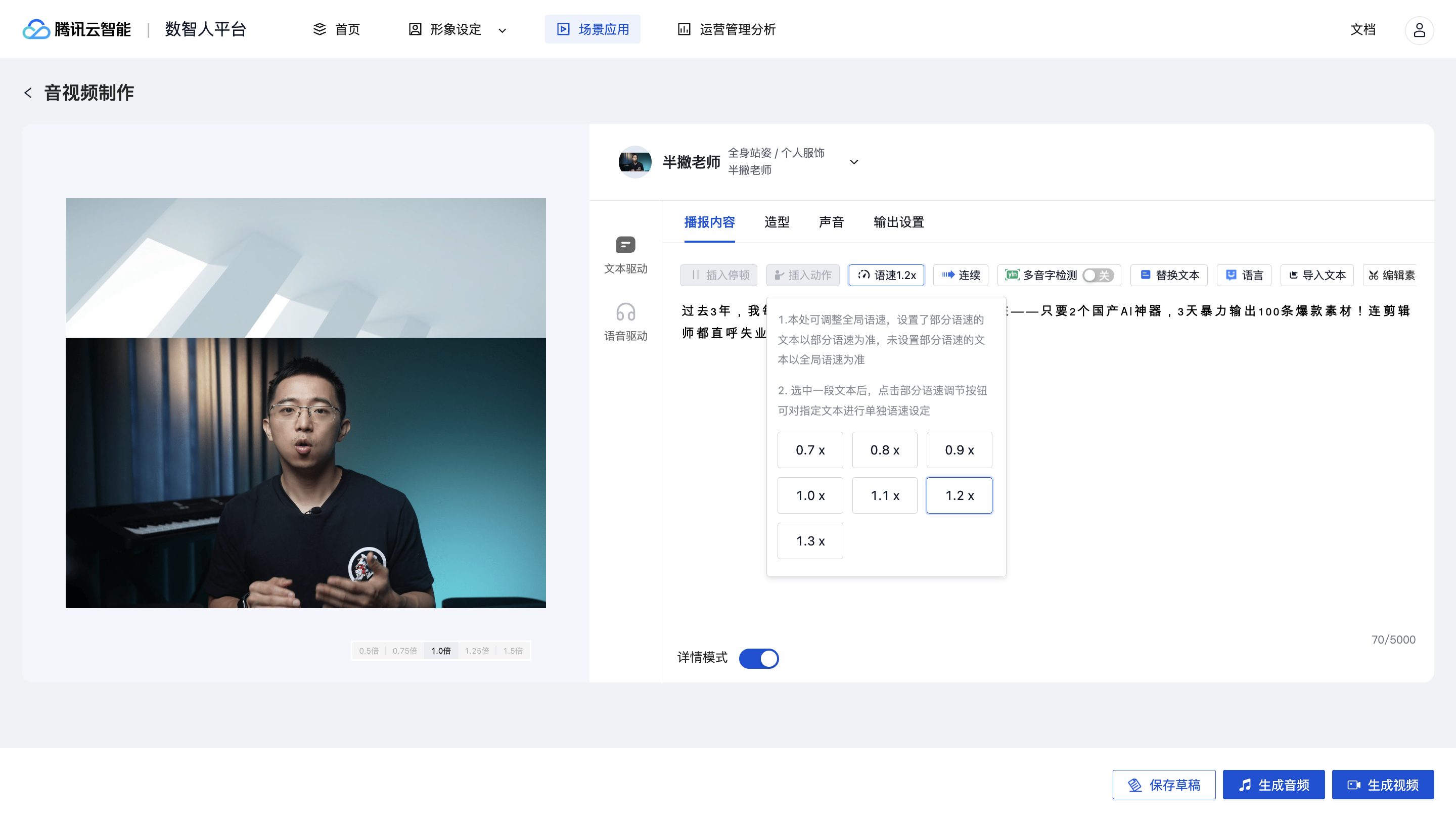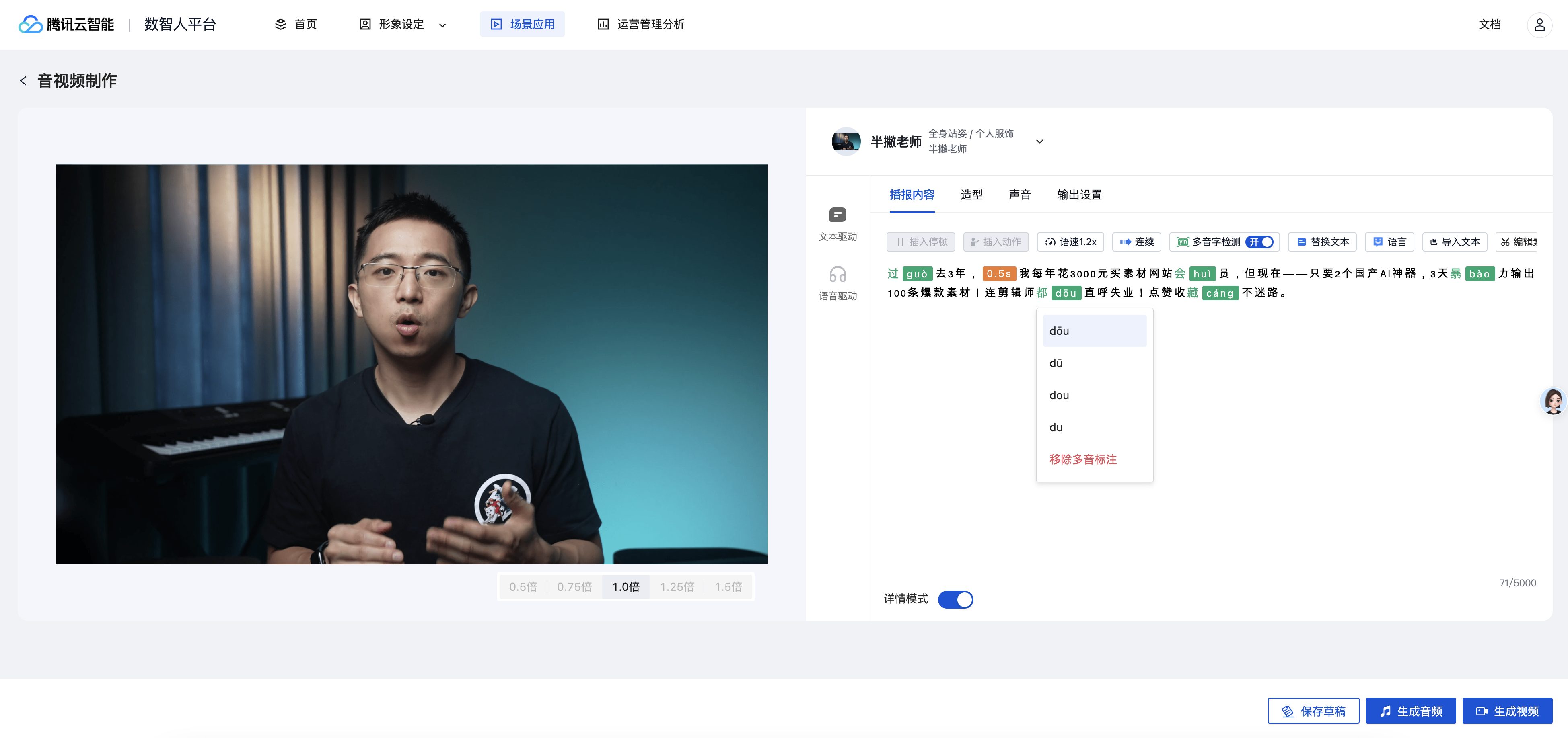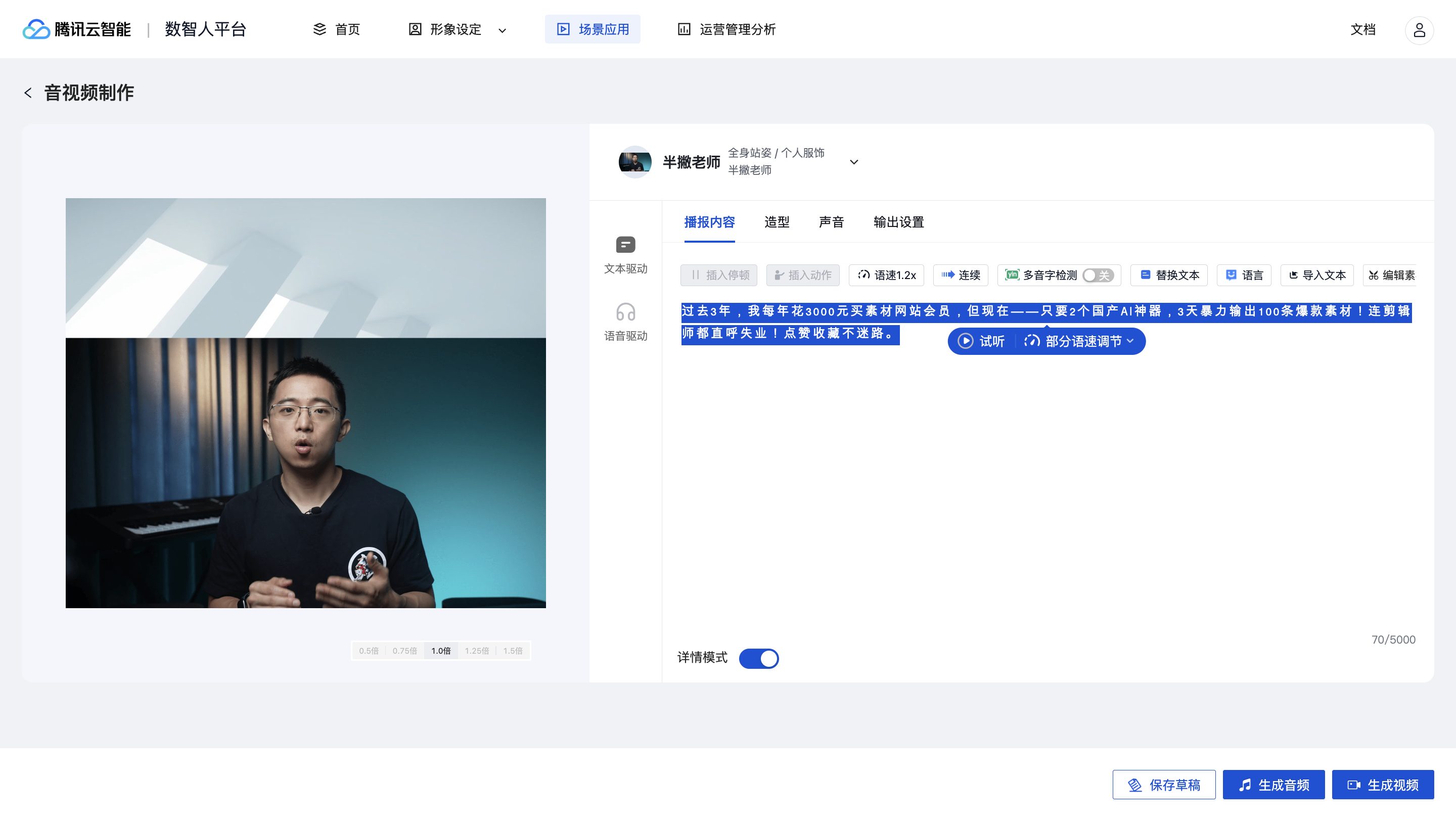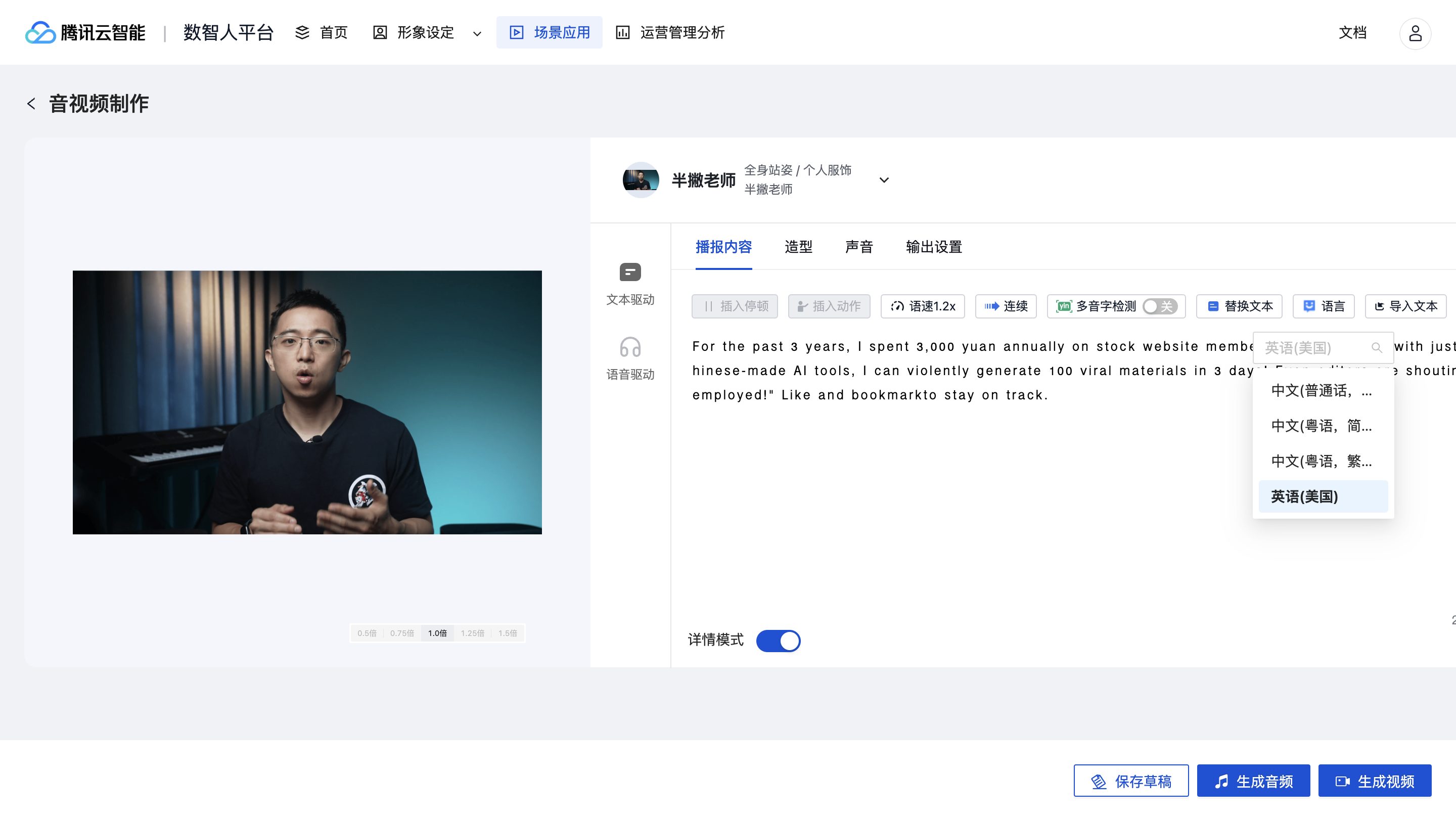 有了脚本,接下来用数字人实现工业化量产,这里我用是用「腾讯云」作为案例,重点注意这三个避坑点。