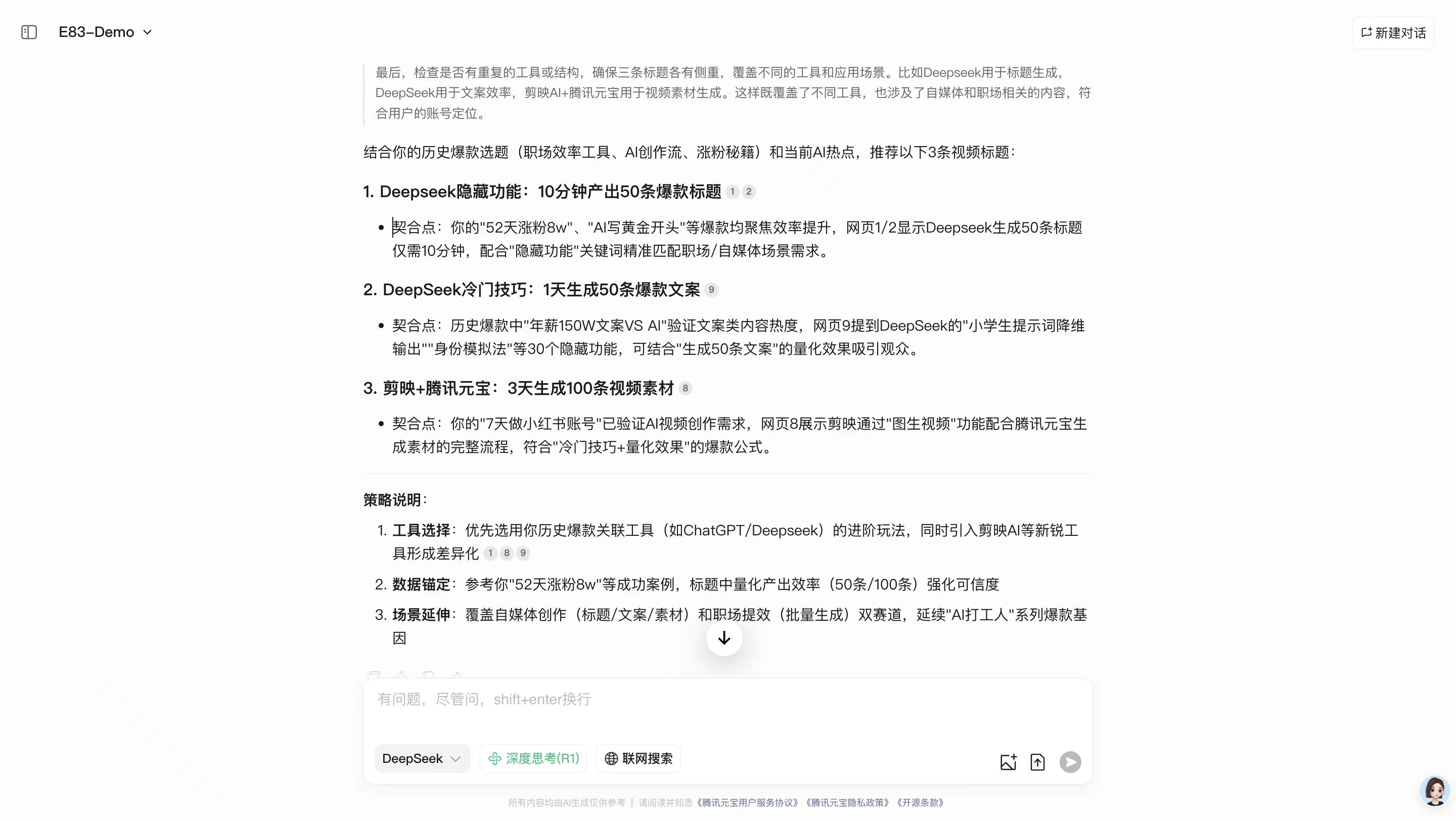 在DeepSeek输入这条结构化指令:作为B站AI应用向的博主,结合当前热点+我的历史爆款,生成3条AI工具教学类视频标题,要求: