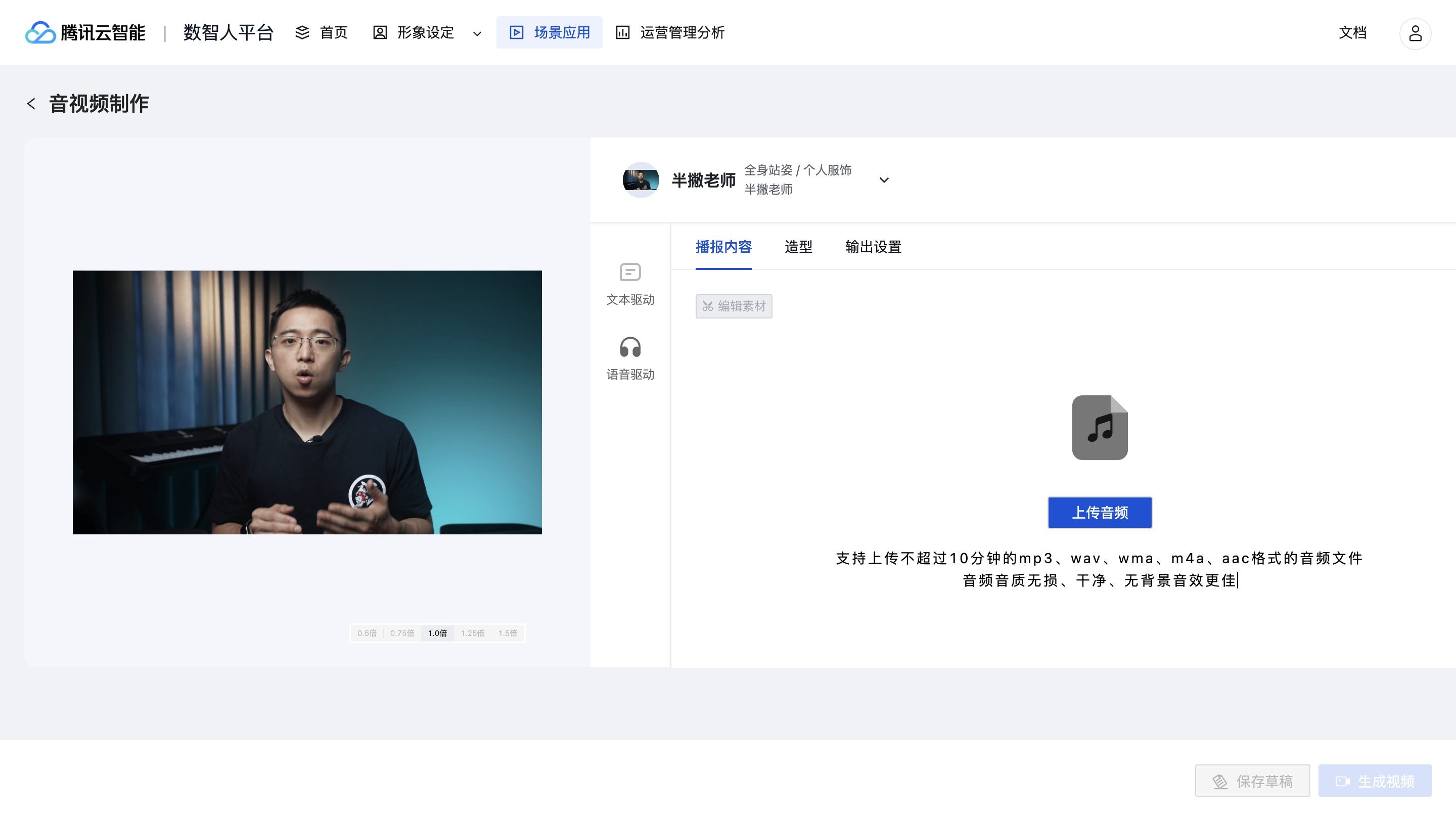 当然,因为我是长视频,而且希望有更好的真实感,所以通常我都是选择语音驱动的模式,因为我脚本写好了,其实直接录制个音频也很快,切换到语音驱动,提交我录制的视频,直接点击生成就好了。