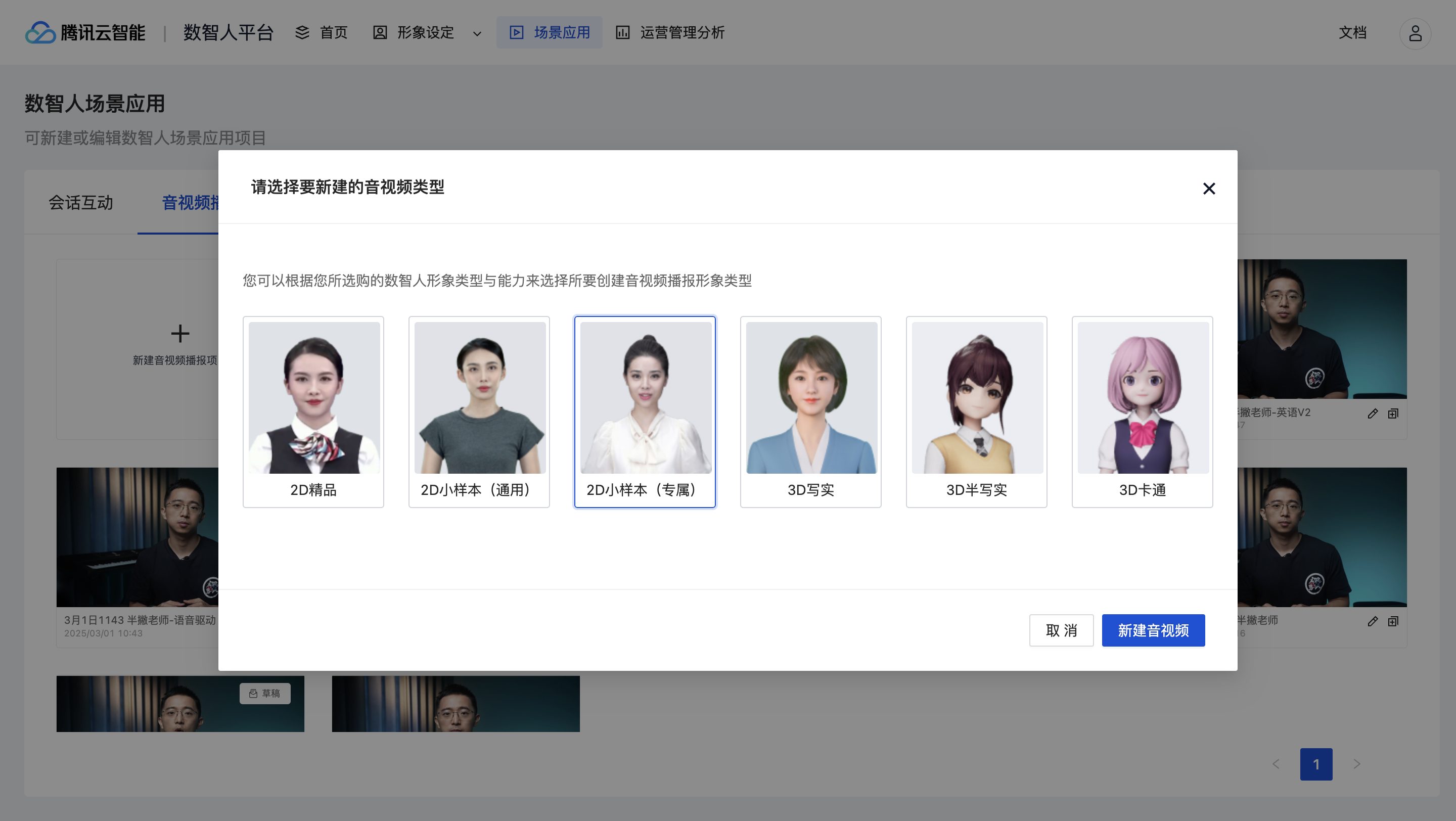 创建数字人完毕后,可以在场景应用下,选择「音视频播报」,选择「2D小样本(专属)」,直接在这里复制Deepseek生成脚本,就可以直接生成视频时。