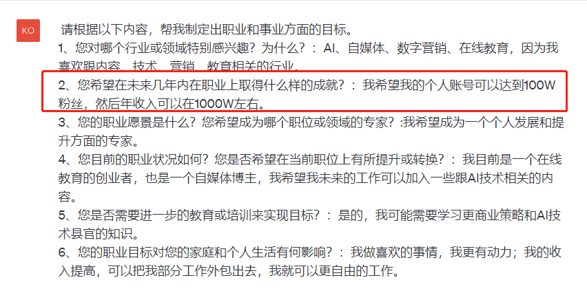 你给AI提供的目标,要结合现阶段自身的能力和条件来设定,确保是可达到的。比如从100W-300W我觉得是一个比较有挑战性,有可能的目标