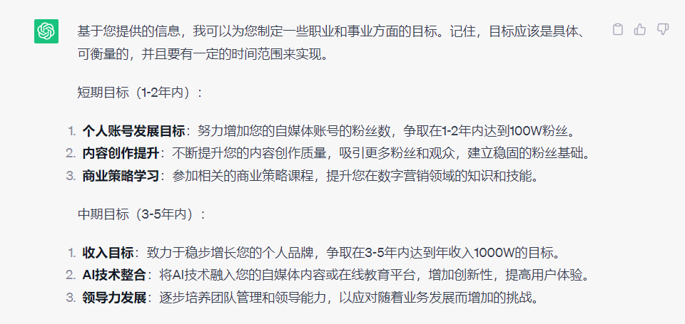 长期职业目标:成为个人发展和提升方面的专家,拥有10W粉丝的个人账号,年收入达到300W,同时加入跟AI技术相关的内容,为自己的创业和自媒体事业带来更大的成功和影响力。