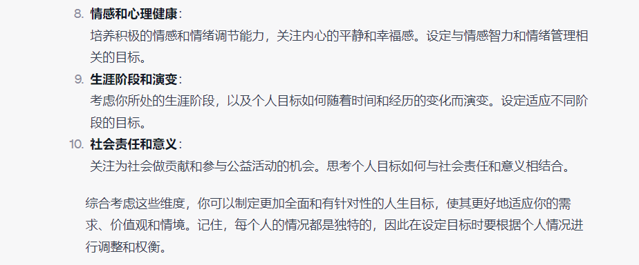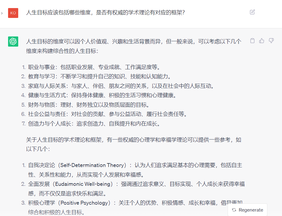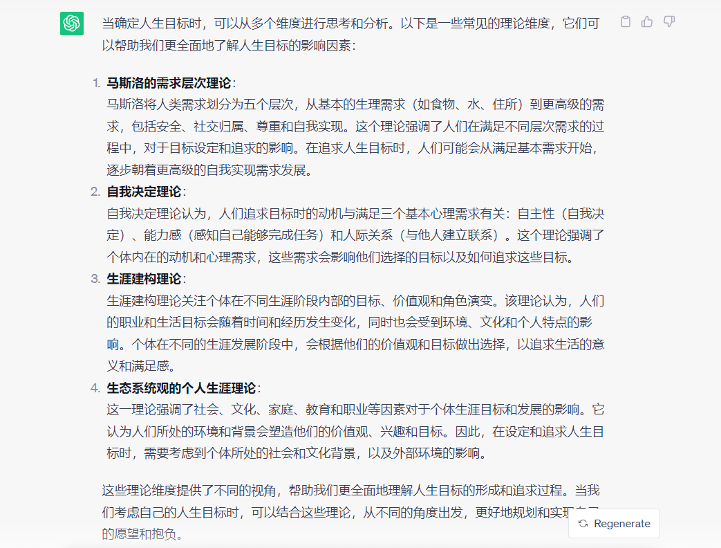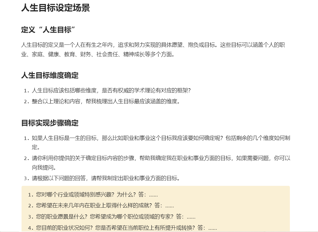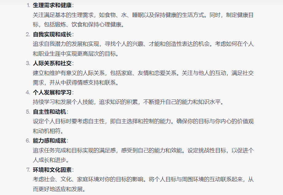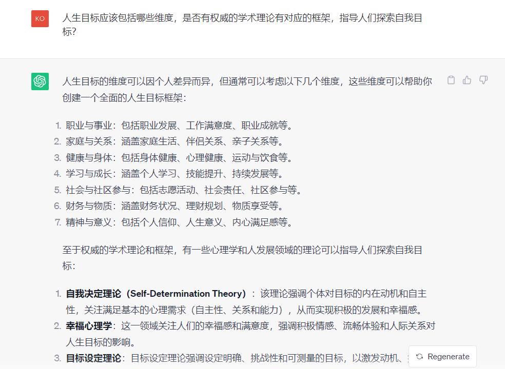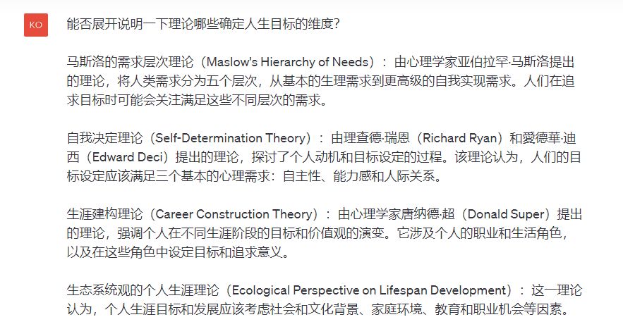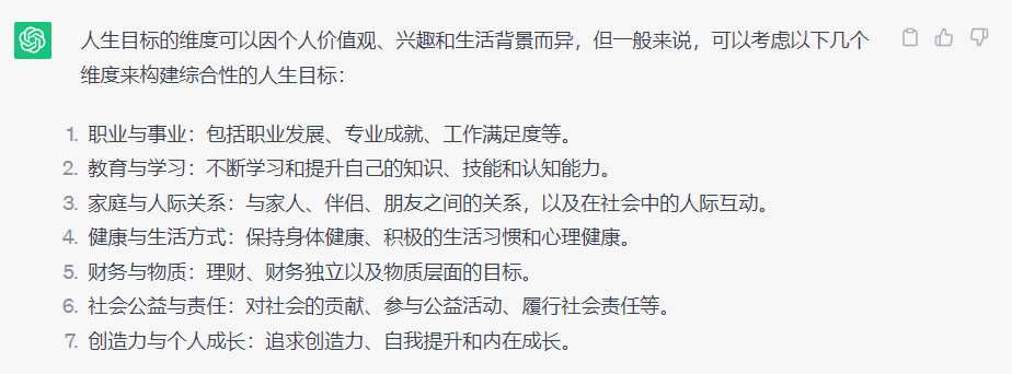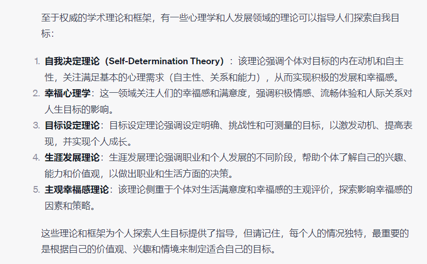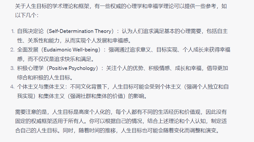 AI交付给了我7个人生目标的维度,包含事业、自我提升、家庭、健康、物质、责任等7个层面的内容,同时提供了四个和人生目标设定相关的心理理论给我参考,包括自我决定、全面发展、积极心理学、个体主义和集体主义。