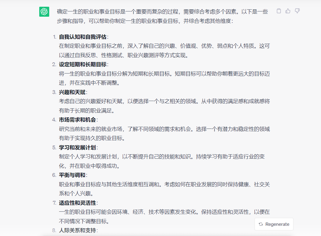 因此如果你用我今天的方法来探索你的职业路径,不必纠结于AI交付的结果跟我的不一样,只要把逻辑梳理好,最终达到利用AI帮你提供人生目标的探索和步骤即可。