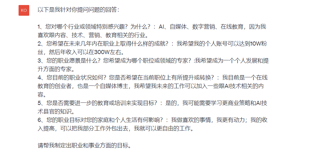 接着这个反馈令我很兴奋:AI提供了几个问题给我,我可以通过问自己这些问题,来逐渐明确我的目标。