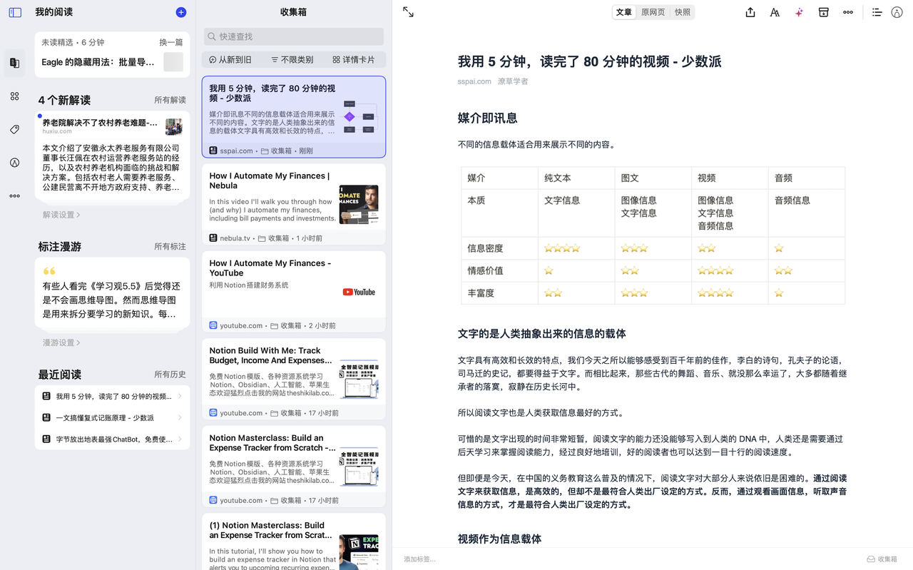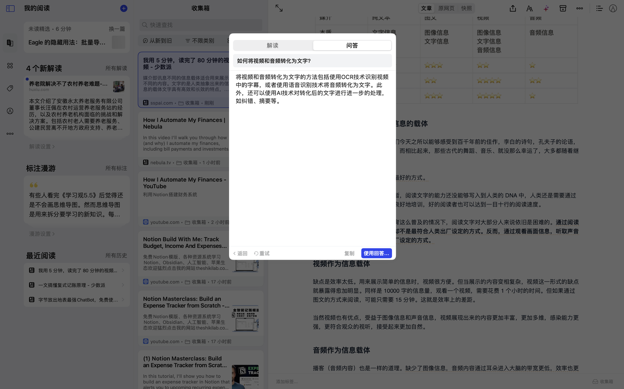 视频的部分:我会使用「Ai课代表」这个插件,可以自动把B站和Youtube的视频变成文章的形式。