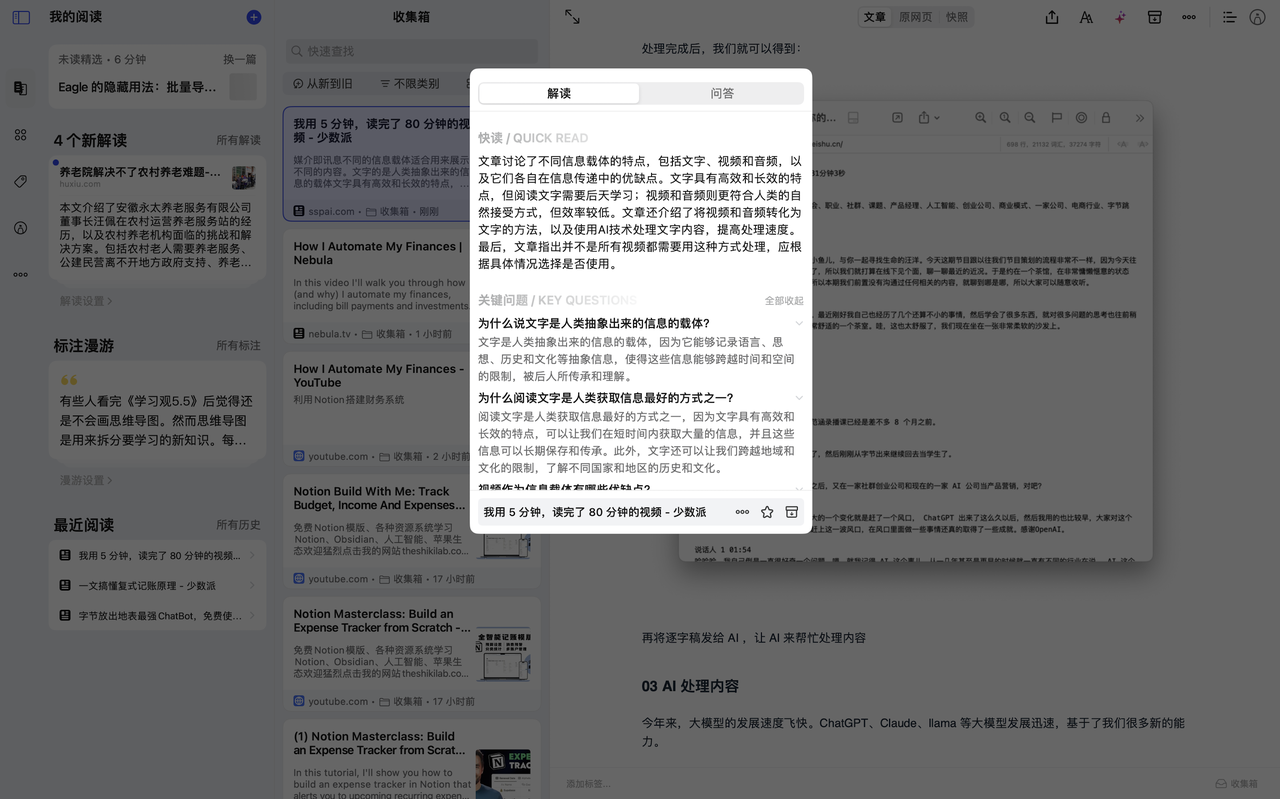 特别对于文章的部分,我会利用Cubox的AI解读功能,帮我快速提炼文章的重点和高亮结论。
