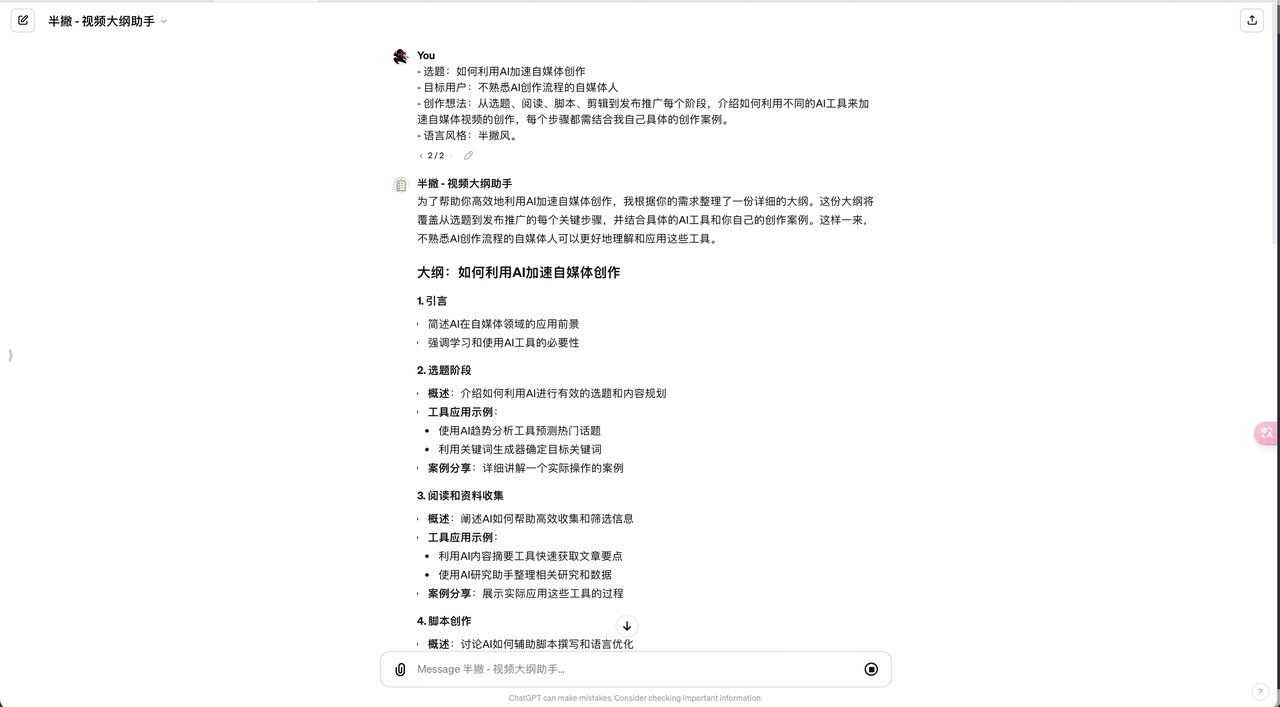 有了基本的思路,我会利用我自己开发的「半撇老师写作助手」GPTs帮我写作。