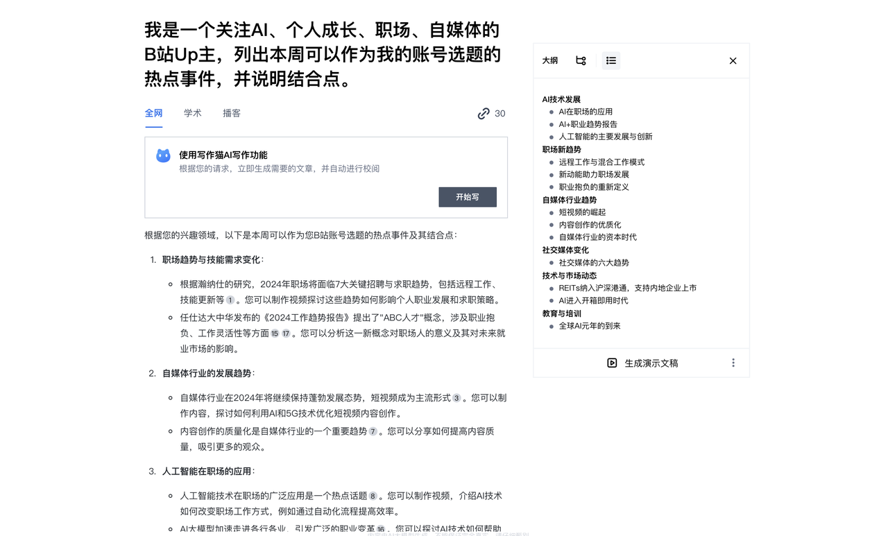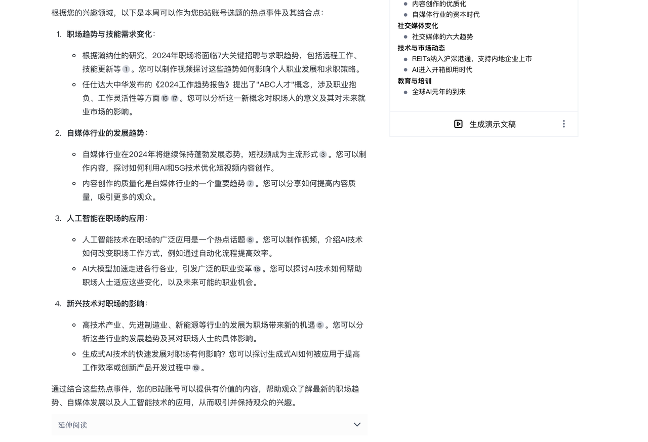 我输入了提示词:我是一个关注AI、个人成长、职场、自媒体的B站Up主,列出本周可以作为我的账号选题的热点事件,并说明结合点。