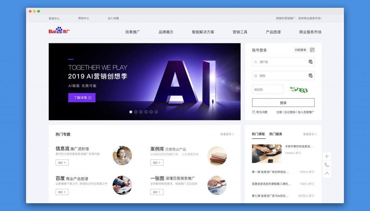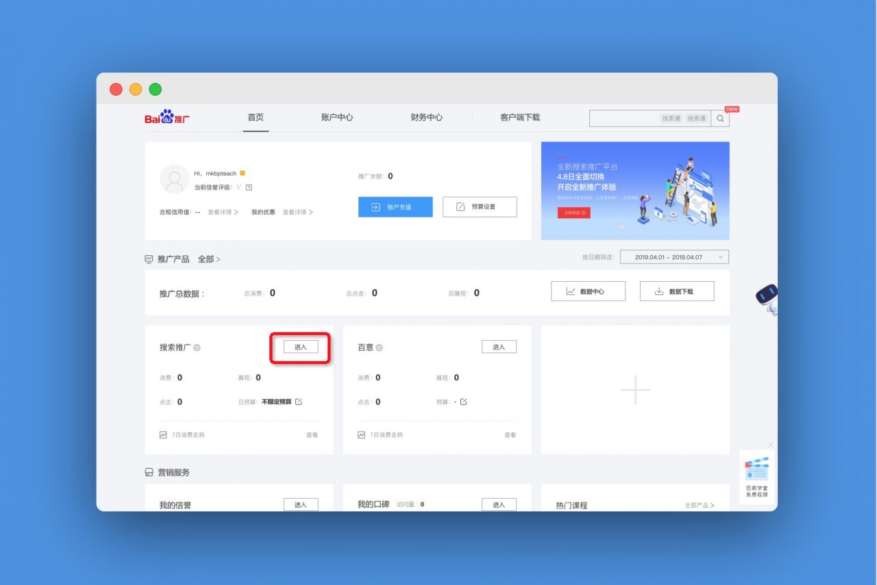 创建账号后,登陆百度推广,在「搜索推广」的地方,点击「进入」。