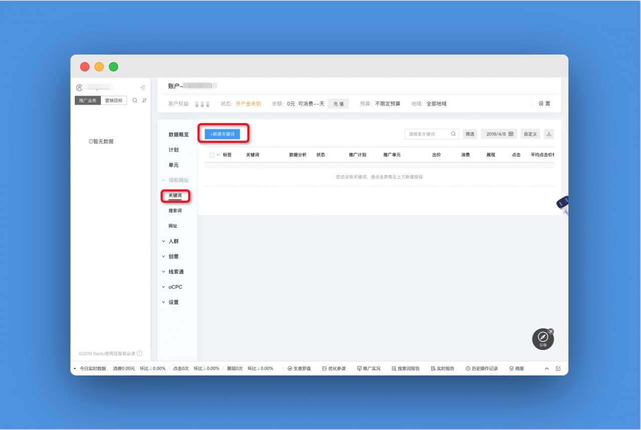 紧接着,你需要点击页面中的「关键词」-「新建关键词」。