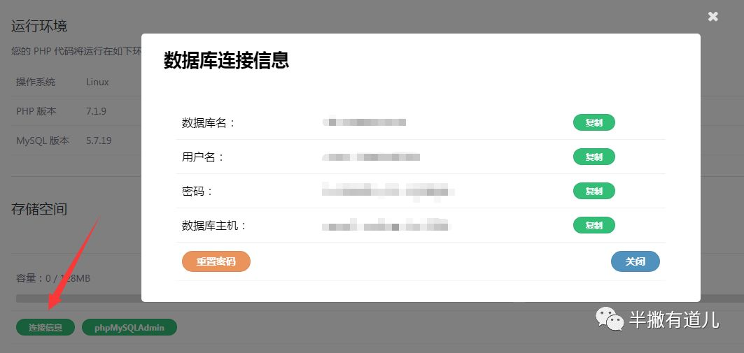3、同时,你需要在这个页面中点击存储空间栏中的「连接信息」获取数据库连接信息。