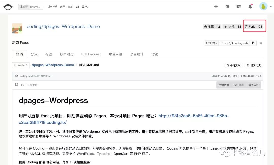 2、「Fork」完毕后,你自己的仓库就会出现名为「dpages-WordPress-Demo」的项目了。你需要在这个项目里点击「代码 -> Pages 服务」,选择「动态 Pages」 选项卡,点击「开启」,选择部署来源,点击「保存」。稍等片刻即可完成部署并通过 xx.coding.io 访问你的网站。
