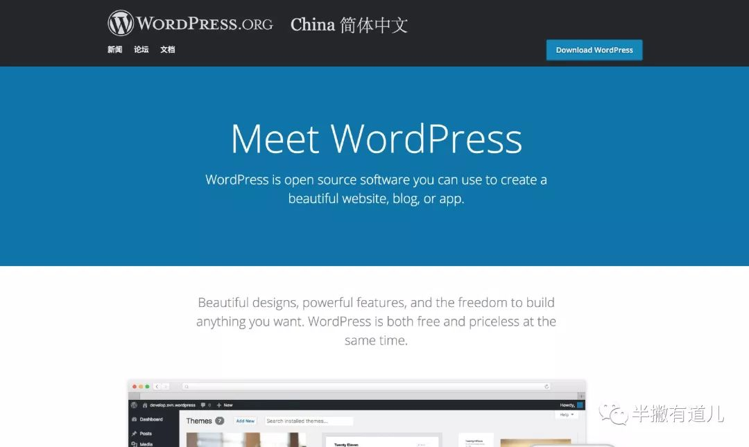 当然 WordPress 到今天其实已经不仅仅是用于做内容管理了,你还可以拿它来开网店、做论坛、做问答社区、搭建企业站点等等(半撇私塾的站点也是使用WordPress 搭建的)。