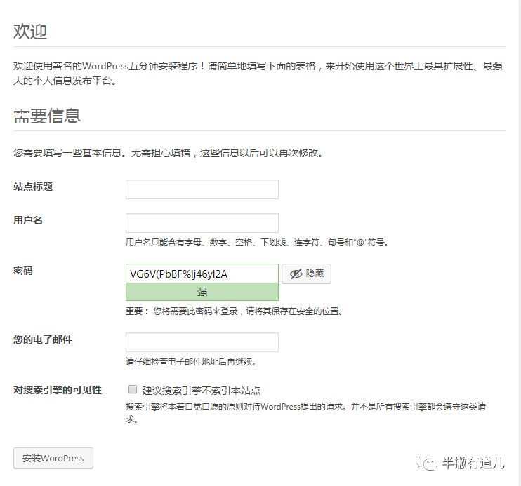 5、填写基本信息,安装 WordPress。