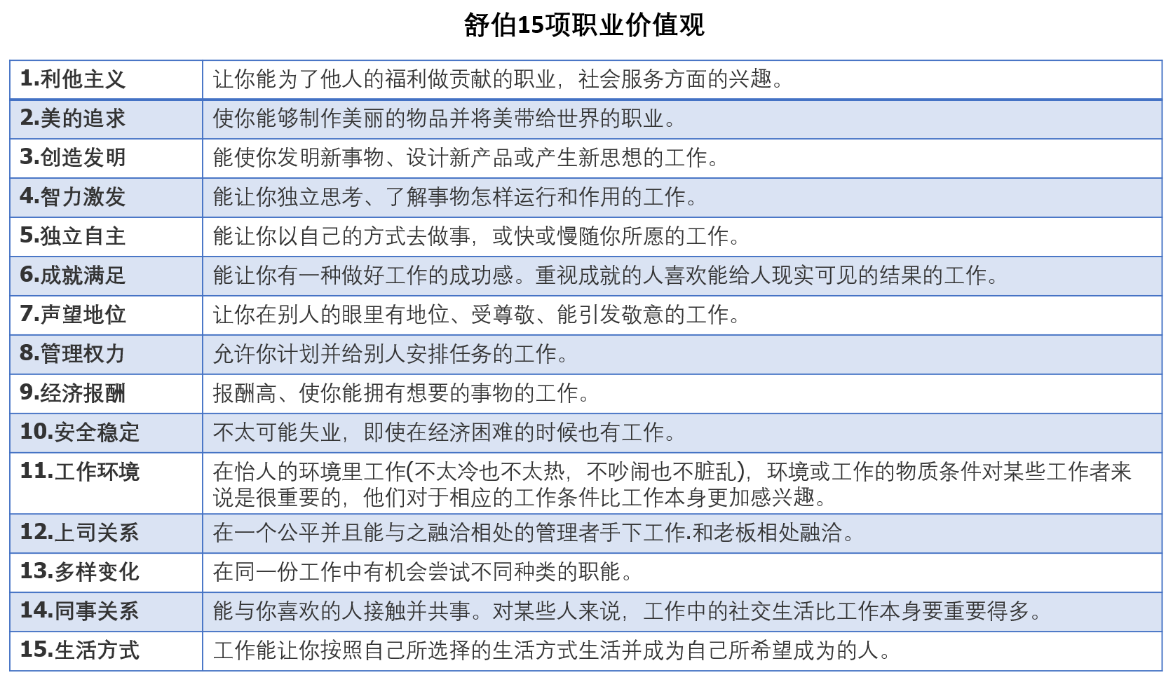 美国的生涯辅导大师舒伯,他在1970年总结了一系列我们在工作中追求的价值,分为15个点。我从中选出我最看重的五个点来回答上面这个问题,也就是智力激发、创造发明、成就满足、独立自主和经济报酬。