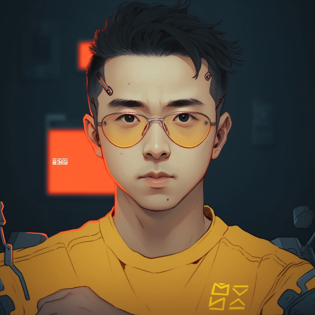 illustration, an avatar of a chinese male, 30 years old, Buzz cut haircut , high tech, professional, duotone, dark and yellow,by Brian M. Vivero —niji 5