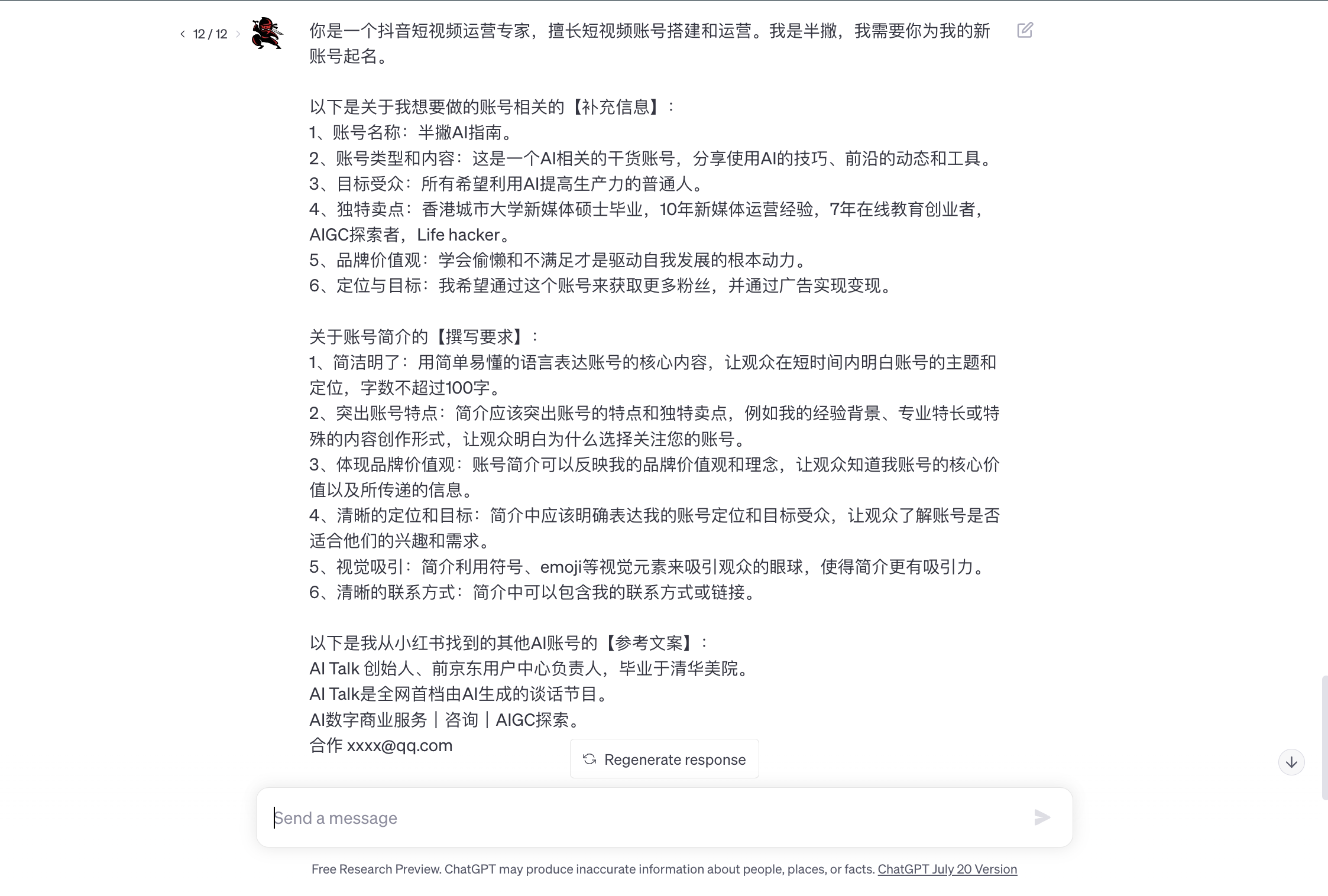chatgpt我们比较熟悉了,前面几期视频都有讲过。因此我们主要来讲一讲咒语的部分。第一步还是给ai提供指令,提供给它的信息尽可能具体。我是这样说的: