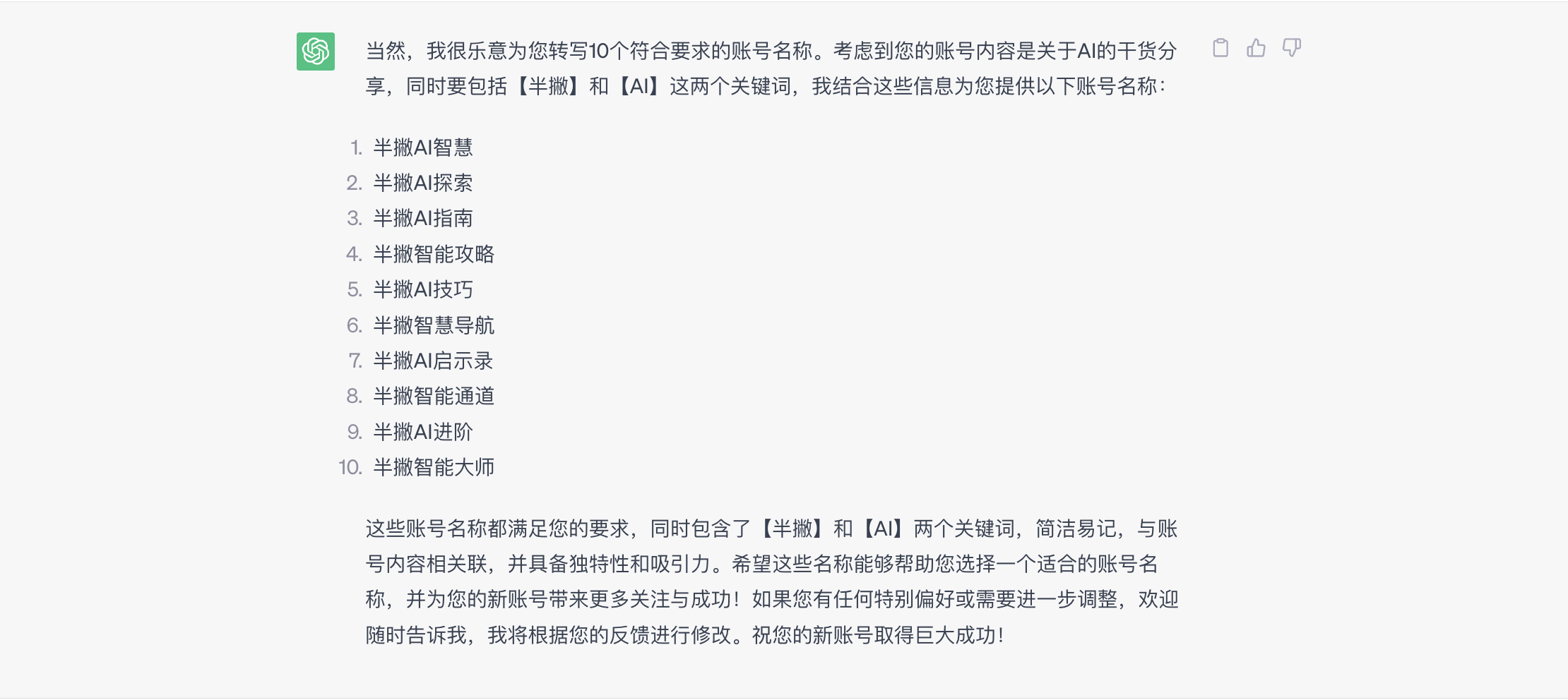 当然,我很乐意为您转写10个符合要求的账号名称。考虑到您的账号内容是关于AI的干货分享,同时要包括【半撇】和【AI】这两个关键词,我结合这些信息为您提供以下账号名称: