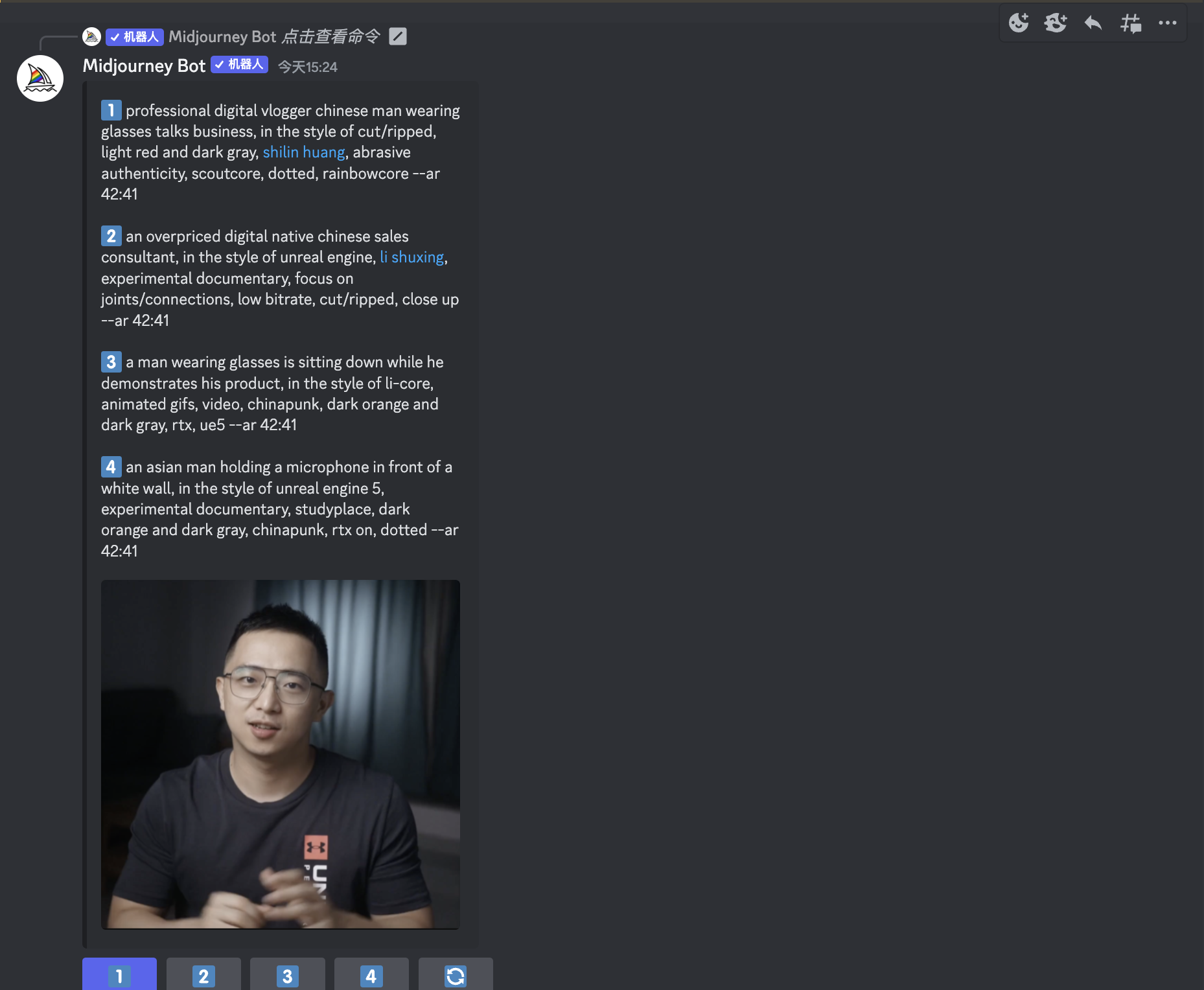 所以我从我的视频中抠图了一张拖动到MJ,点击“+”号上传,然后复制链接出来备用,并且我会使用describe这个命令帮我获取到这个图片的一些关键词,后面咒语可能会用到,比如professional 这个词也是这个步骤给我的灵感。