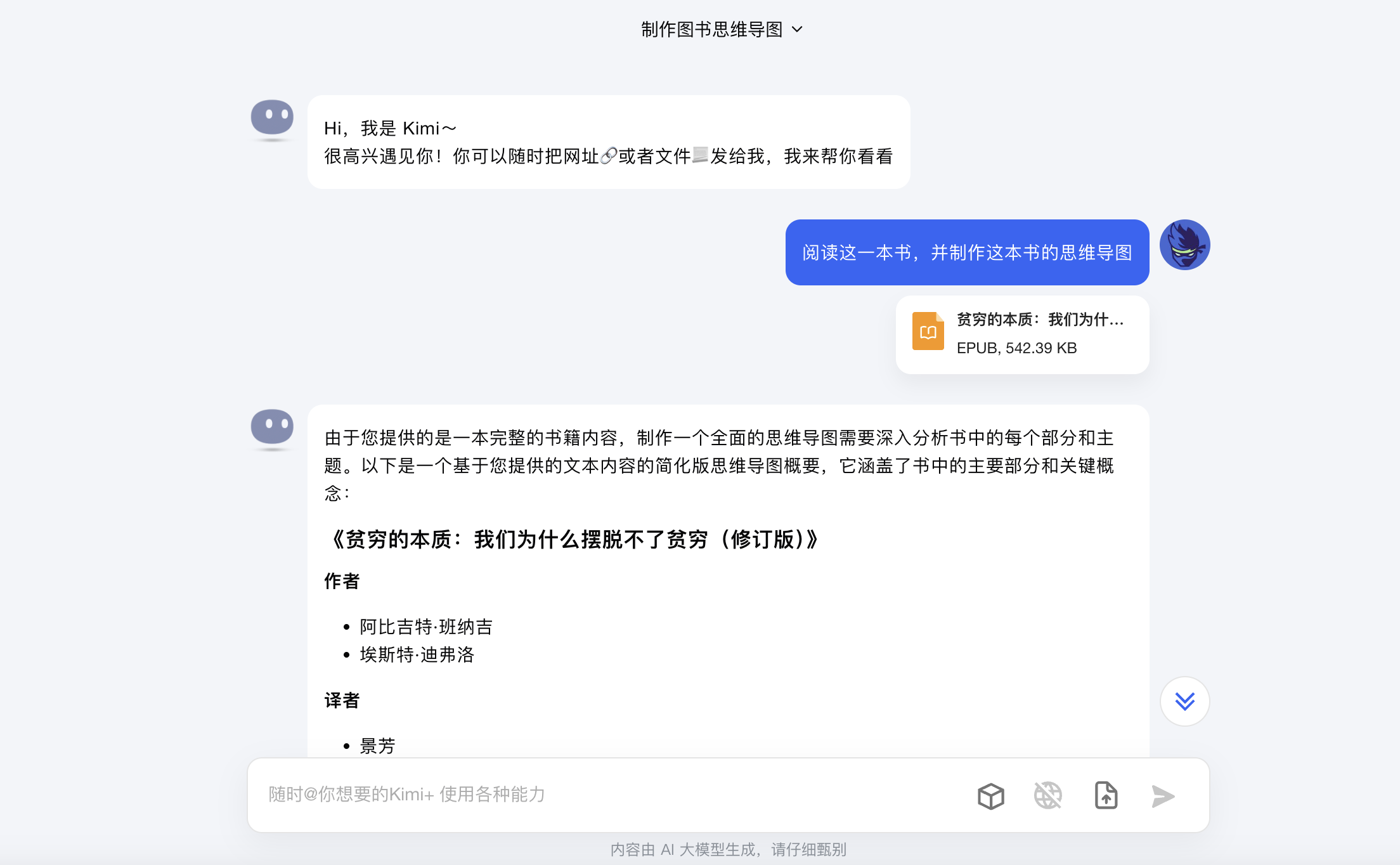 因为整理一本书的思维导图也是比较费事,这个过程我会利用AI来完成,比如在Kimi中让AI根据电子书的内容做总结,然后再把内容放到飞书脑图中。