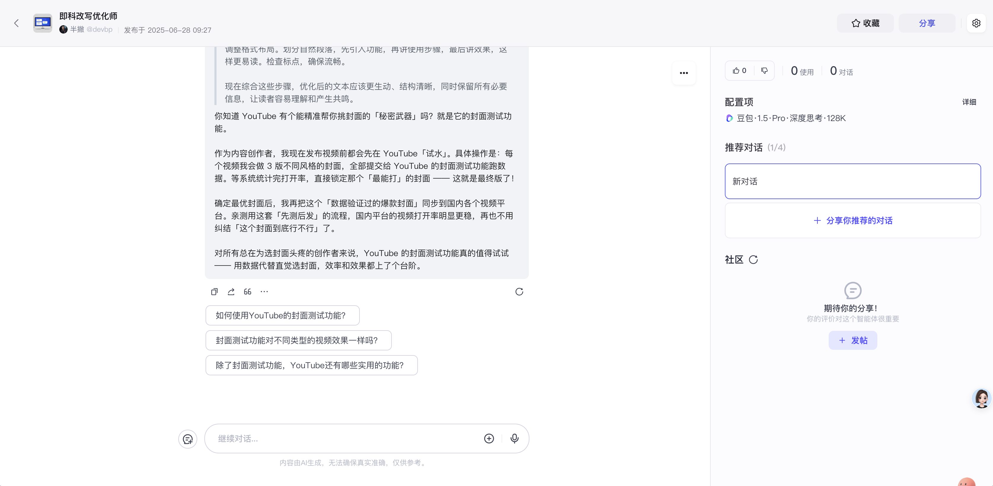 - 日更短内容:每天,我会花10分钟,语音录下我的每日分享,可以是新的AI资讯、好的提示词、用AI的心得等等,然后转文本后丢给Coze的智能体,变成自己的语言风格,你看一下这个前后的效果,最后再短内容发布公开渠道,比如我的AI圈子、朋友圈、博客、即刻等等。