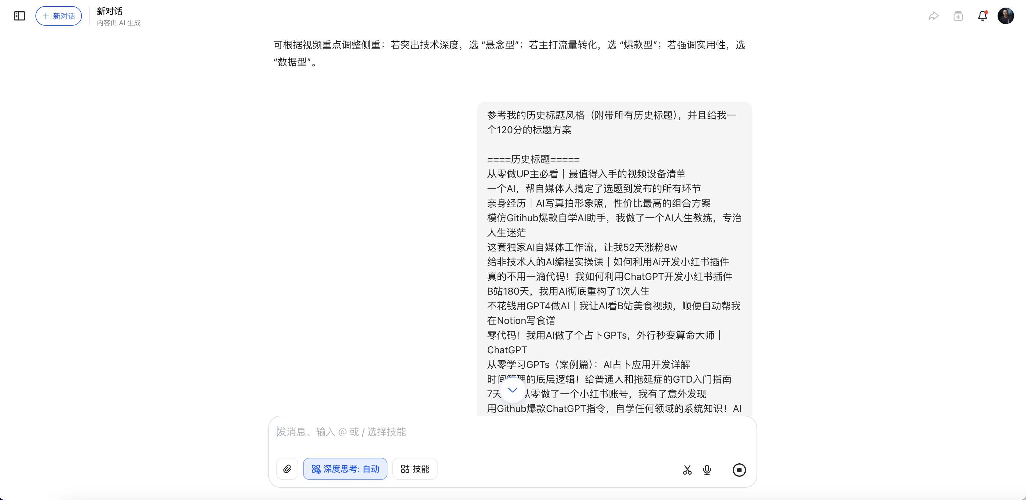 后来我摸索出 “指令控 AI” 的流量密码,比如我会在扣子的指令里加了句:“参考我的历史标题风格(附带所有历史标题),并且给我一个120分的方案” 。