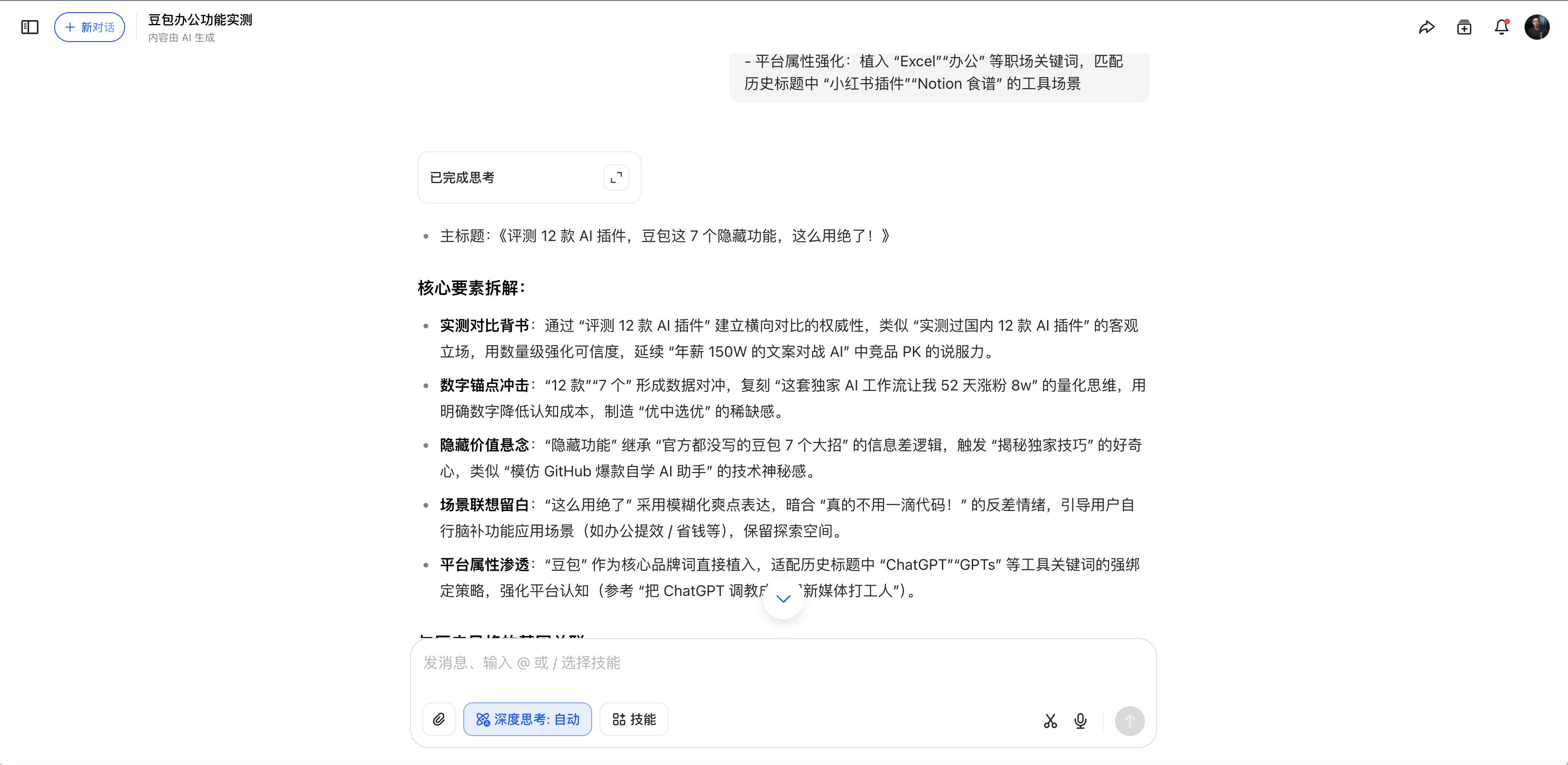 优化后:《评测12款AI插件,豆包这7个隐藏功能,这么用绝了!》不仅人的味道更充足了,而且悬念和冲突感强多了。