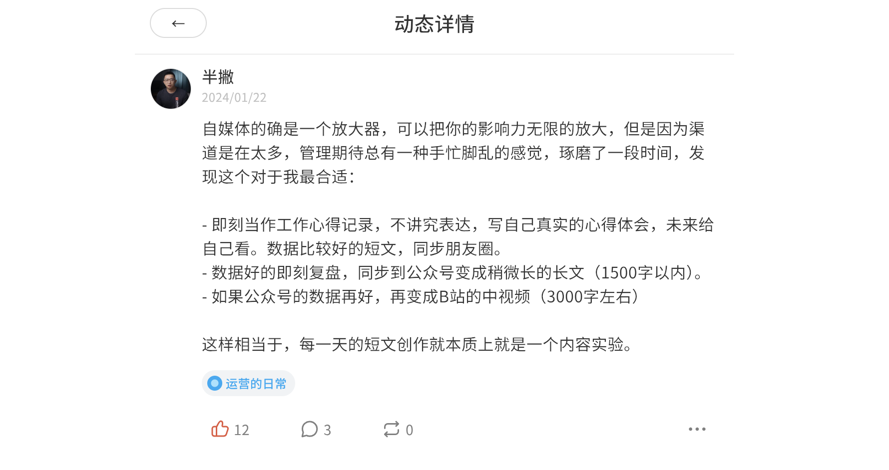 周更长内容:每周,再利用AI把这一些点赞比较多的短内容,按照特定的主题整合一片长文或者长视频。这样相当于,每一天的短文创作就本质上长内容的一个内容实验。而内容实验这个点,正是我之前在即刻和圈子中点赞比较多的。