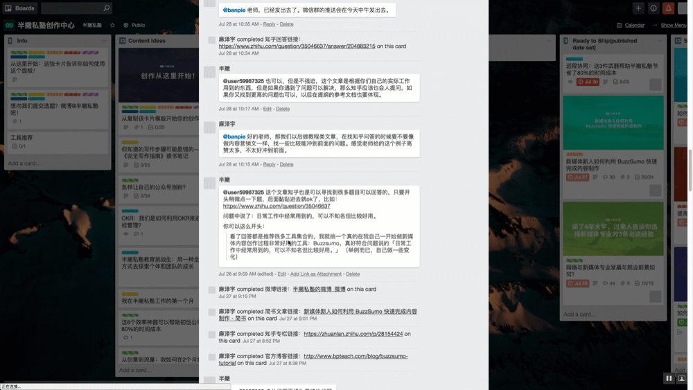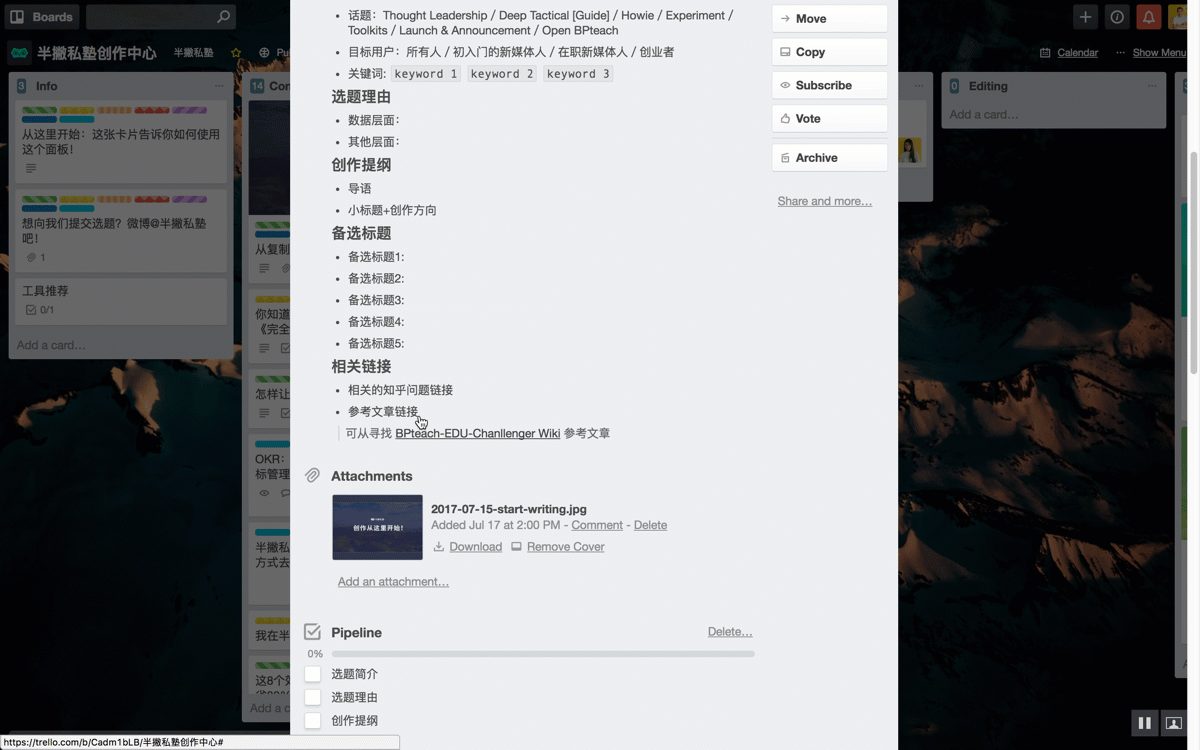 这样一来通过 Trello,新的成员可以清楚的知道完成一个写作任务需要经历哪些步骤,应该如何完成,编辑也可以快速的跟踪到每一个任务具体进展到什么程度。