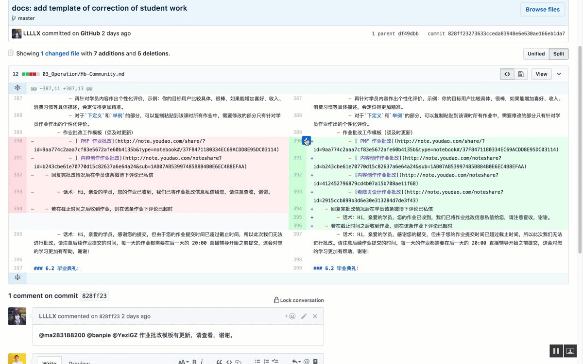 - 逐句的同行审阅:当我们收到同事要审阅邀请时,我们可以直接在提交的页面上,对某个句子提交反馈,比如错别字或者内容结构,而且可以@相关人进行必要的辅助。