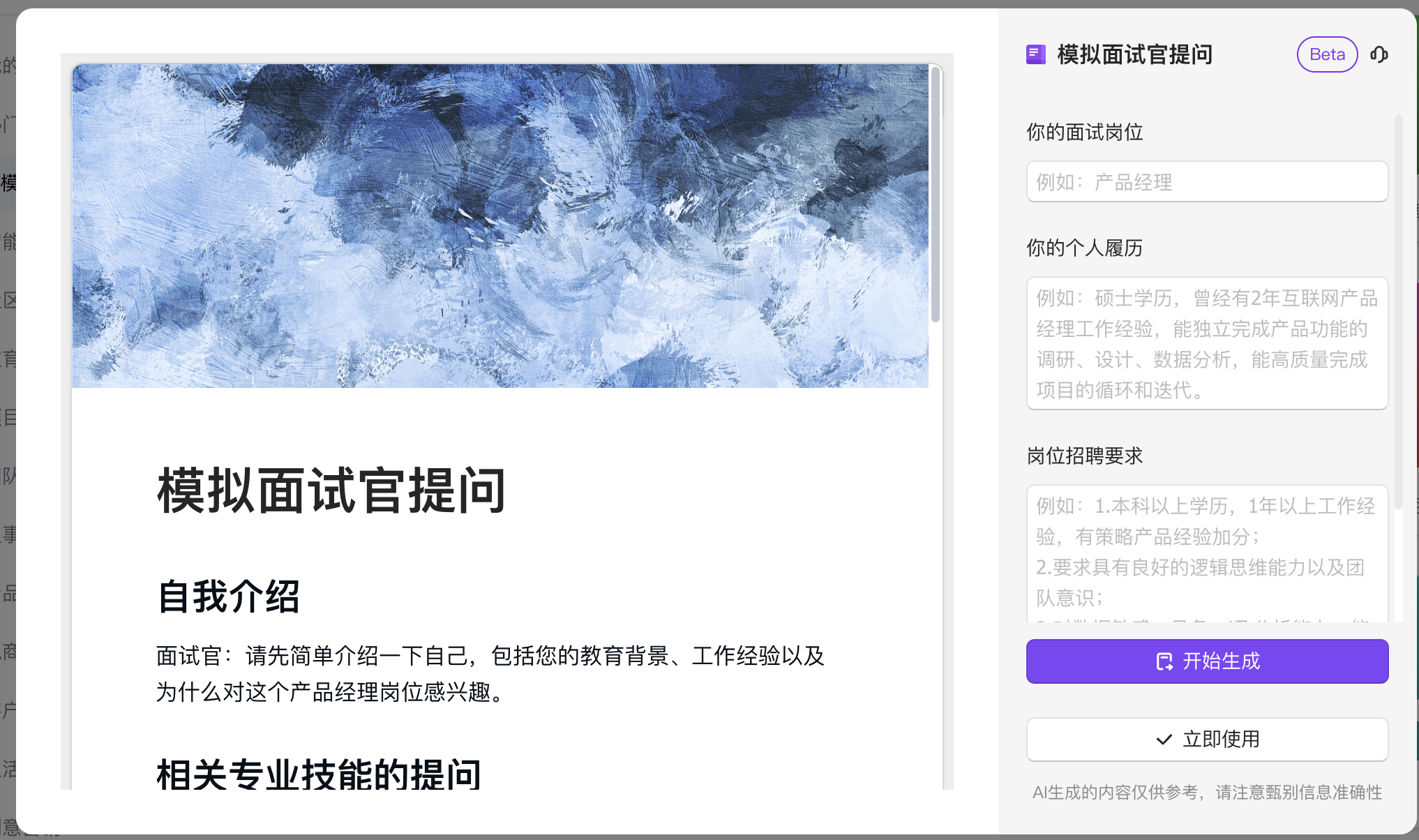 比如,你可以使用「金山文档」快速创建你的面试话术,这个要比 GPT要快捷很多。进入 AI 模版,下拉选择【模拟面试官提问】,然后把你的简历内容和应聘岗位的 JD 复制进来,一个脚本很快就生成好了。