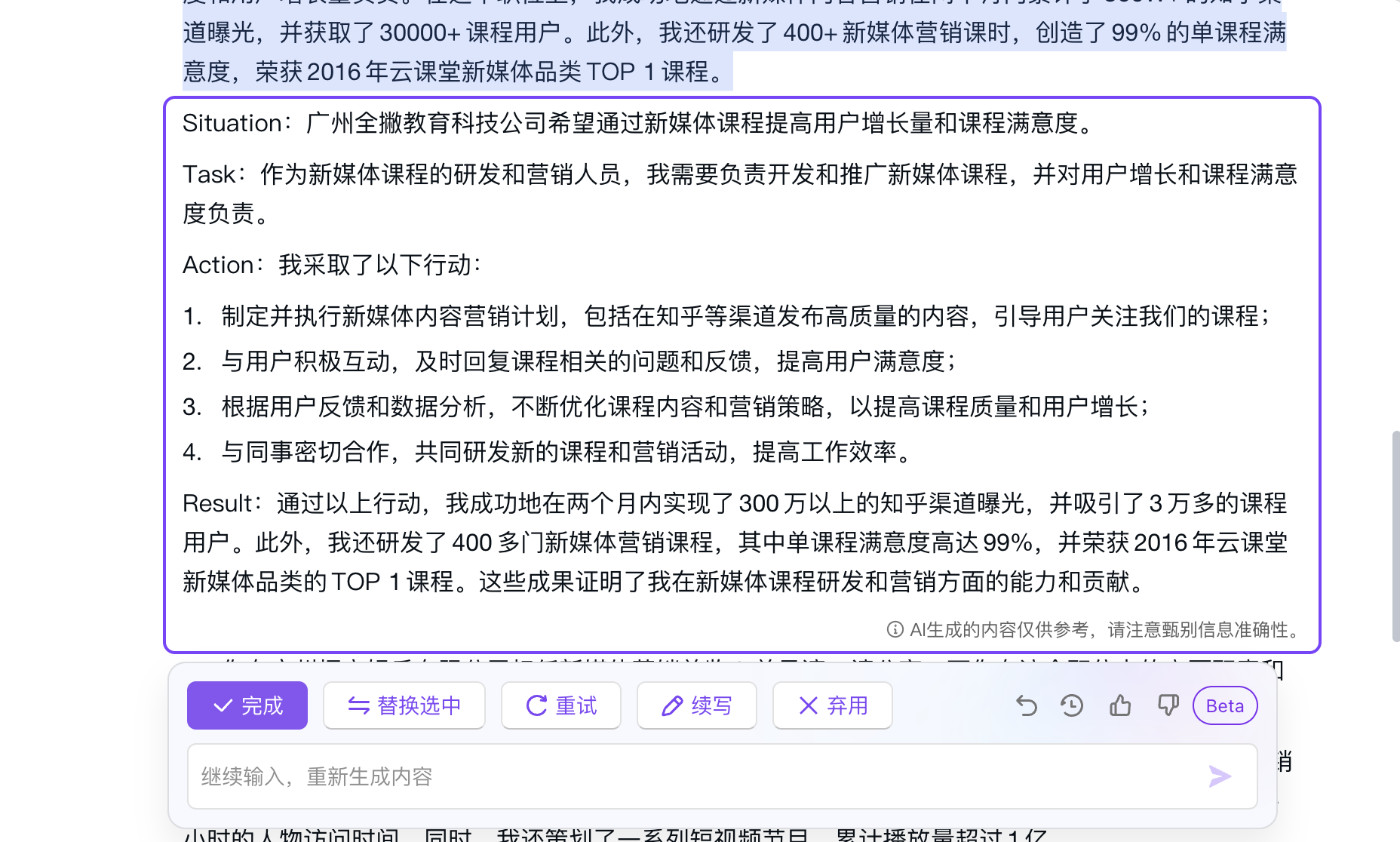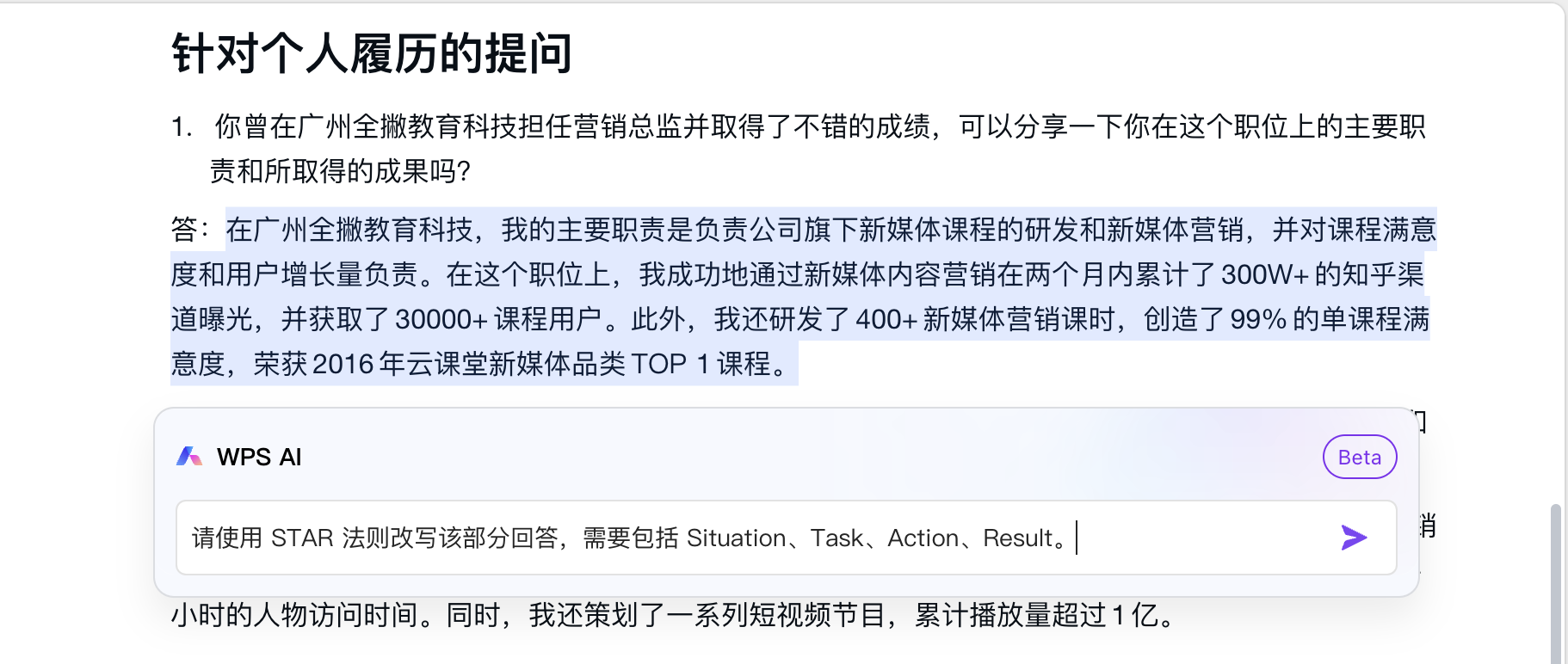 模板可以根据你的关键词快速生成可能遇到的问题及对应的回答,我们还可以更进一步,尽量用 STAR 的法则来优化,指令如:请使用 STAR 法则改写该部分回答,需要包括 Situation、Task、Action、Result。